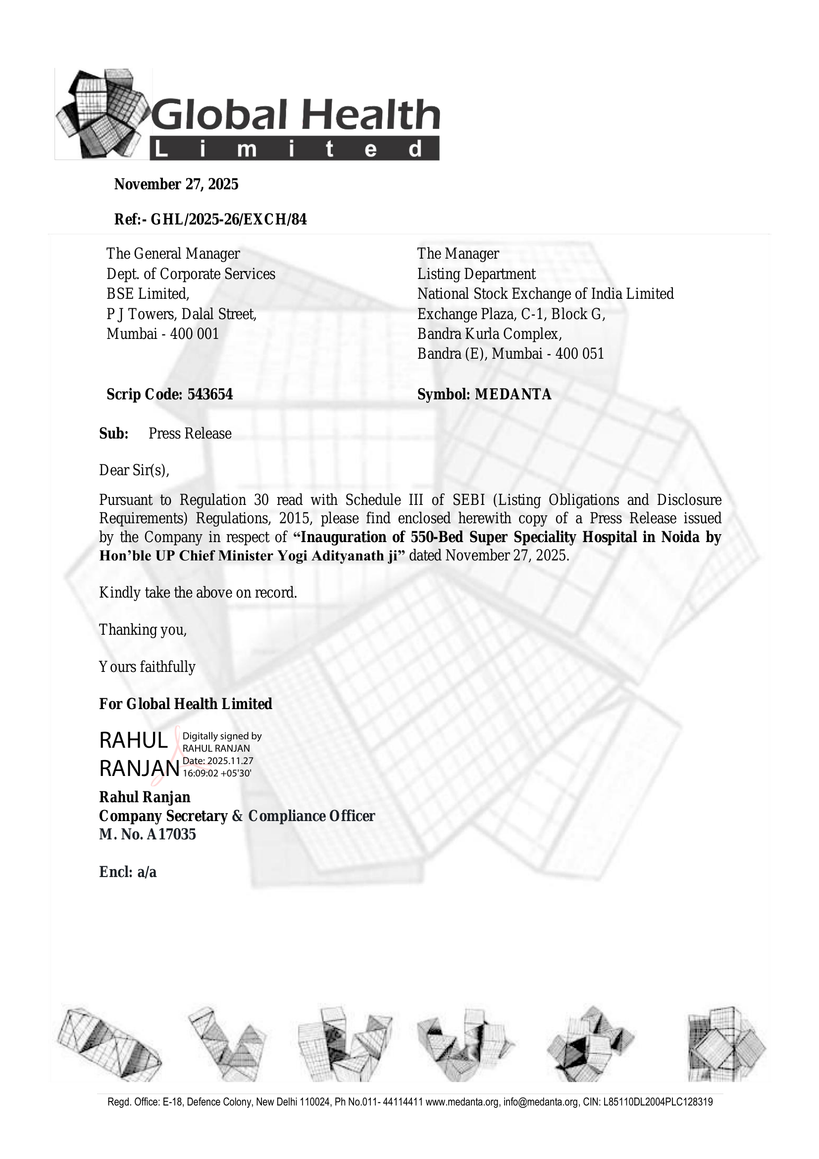 Global Health Ltd. - Medanta's New Super Specialty Hospital in Noida - Medanta, affiliated with Global Health Ltd., inaugurates a 550-bed super specialty hospital in Noida. - Located in Sector 50 with direct Metro access, offering 25+ super specialties and advanced tech. - Features 130+ ICU beds an...