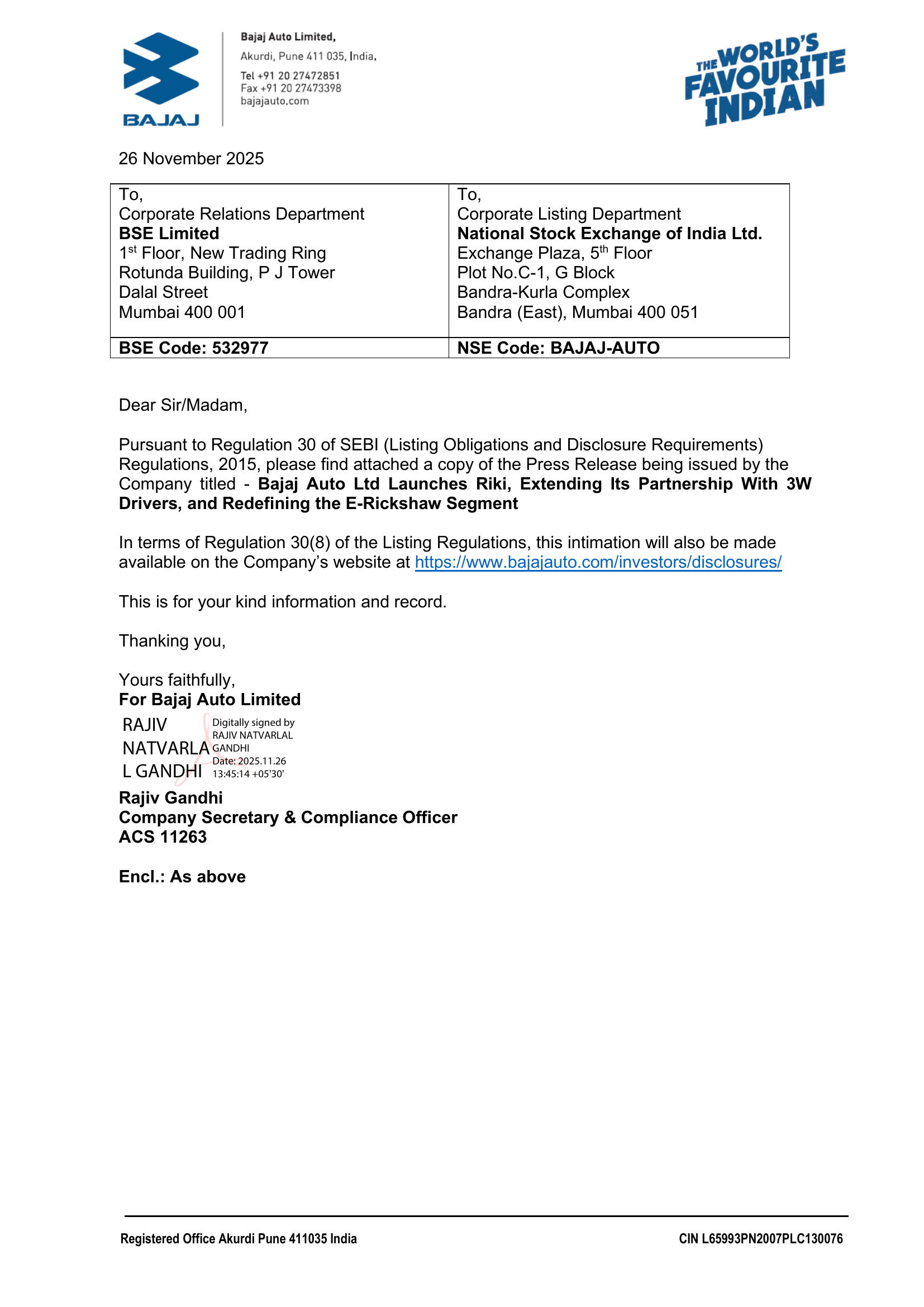 Bajaj Auto Ltd Launches New E-Rickshaw 'Riki' - Strategic Expansion in Last-Mile Mobility - Bajaj Auto Ltd introduces the 'Riki' e-rickshaw model, targeting last-mile mobility. - Features a 5.4 kWh battery, with ranges of 149 km (Riki P4005) and 164 km (Riki C4005). - Priced at INR 1,90,890 and INR...