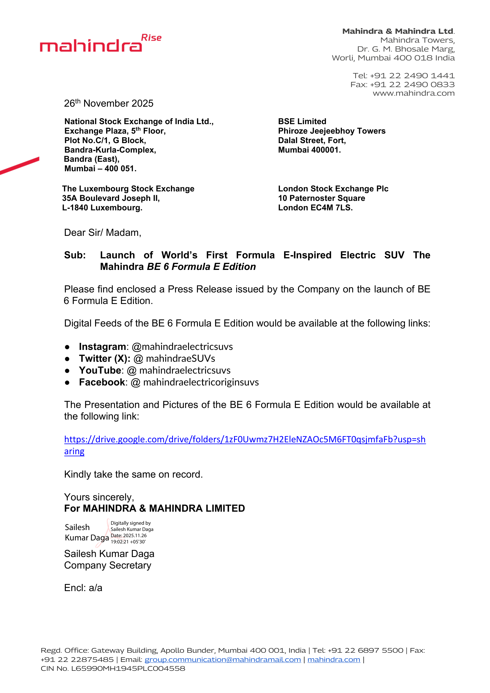 Mahindra & Mahindra Ltd. Launches BE 6 Formula E Edition Electric SUV - Limited-edition electric SUV inspired by Formula E racing - Priced at ₹23.69 lakh (FE2) and ₹24.49 lakh (FE3) - Bookings open on 14th January 2026; deliveries from 14th February 2026 - Features: 79 kWh battery, 282 bhp, 500 km ...
