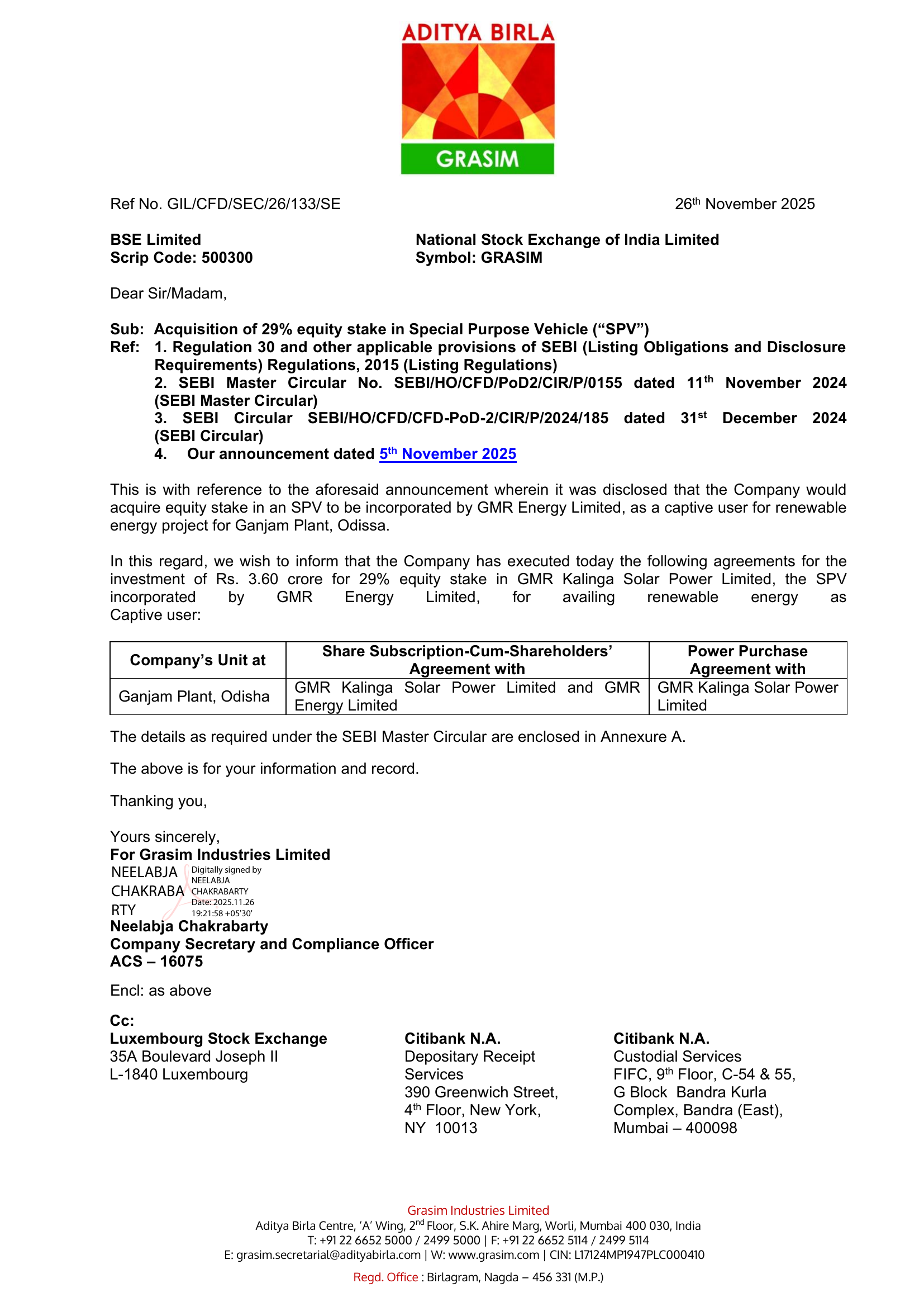 Grasim Industries Ltd. Acquires Stake in GMR Kalinga Solar Power - Grasim Industries to acquire 29% stake in GMR Kalinga Solar Power for Rs. 3.60 crore - Investment to be completed within 30 days - SPV developing 10 MW solar project in Odisha - Transaction is non-related-party - Aims to enhance gre...