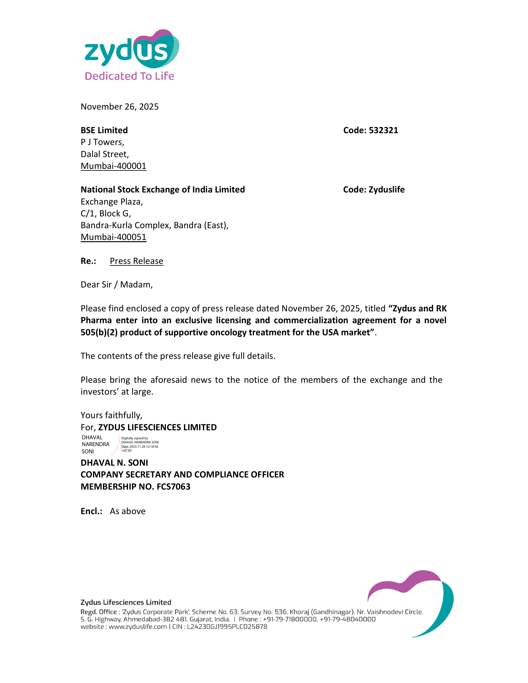 Zydus Lifesciences Ltd. Announces US Oncology Product Licensing with RK Pharma - Zydus Lifesciences Ltd. signs exclusive licensing agreement with RK Pharma Inc. for a novel oncology injectable. - Focused on the US market, targeting a TAM of ~6.2 million units. - RK Pharma to manufacture and supply;...