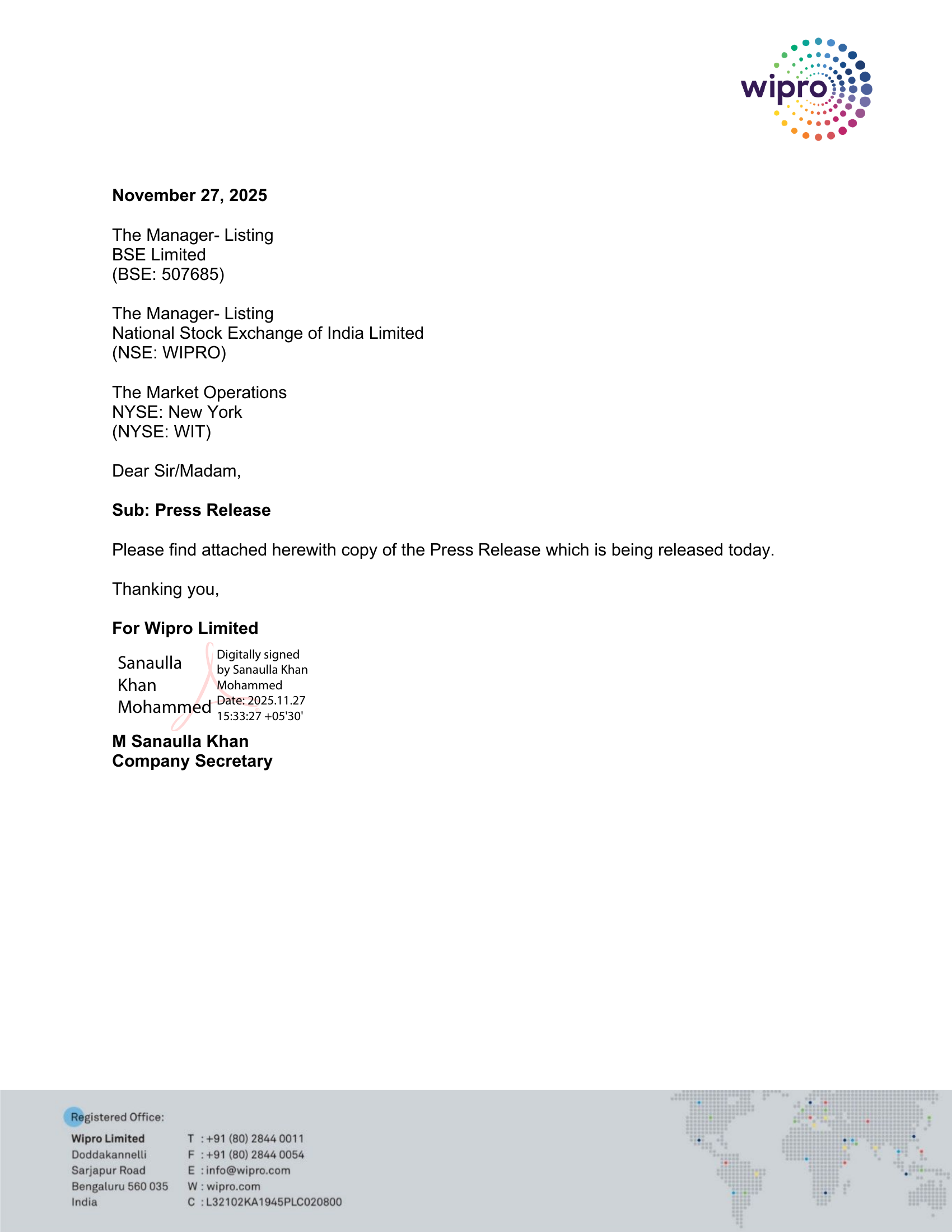 Wipro Ltd. Announces Strategic Alliance with IISc and FSID - Wipro Ltd. partners with IISc and FSID to advance frontier technologies. - Focus areas include agentic AI, quantum AI, and secure digital infrastructure. - Joint research program to develop quantum computing, AI models, and autonomous net...