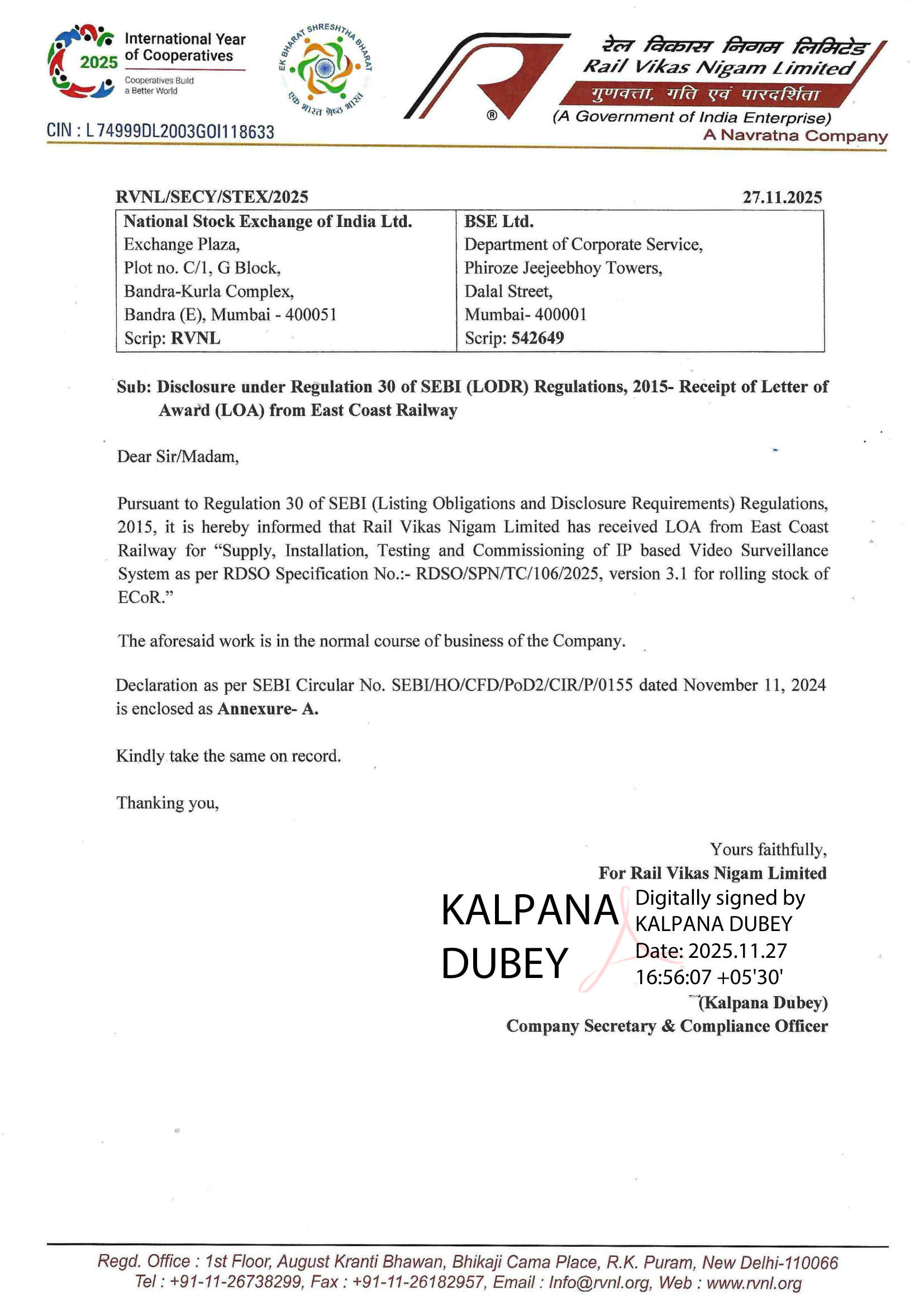 Rail Vikas Nigam Ltd. Receives LOA for IP-based Video Surveillance System from East Coast Railway - Rail Vikas Nigam Ltd. awarded a ₹9.64 crore contract by East Coast Railway for IP-based Video Surveillance System. - Scope includes supply, installation, testing, and commissioning of the system for ...