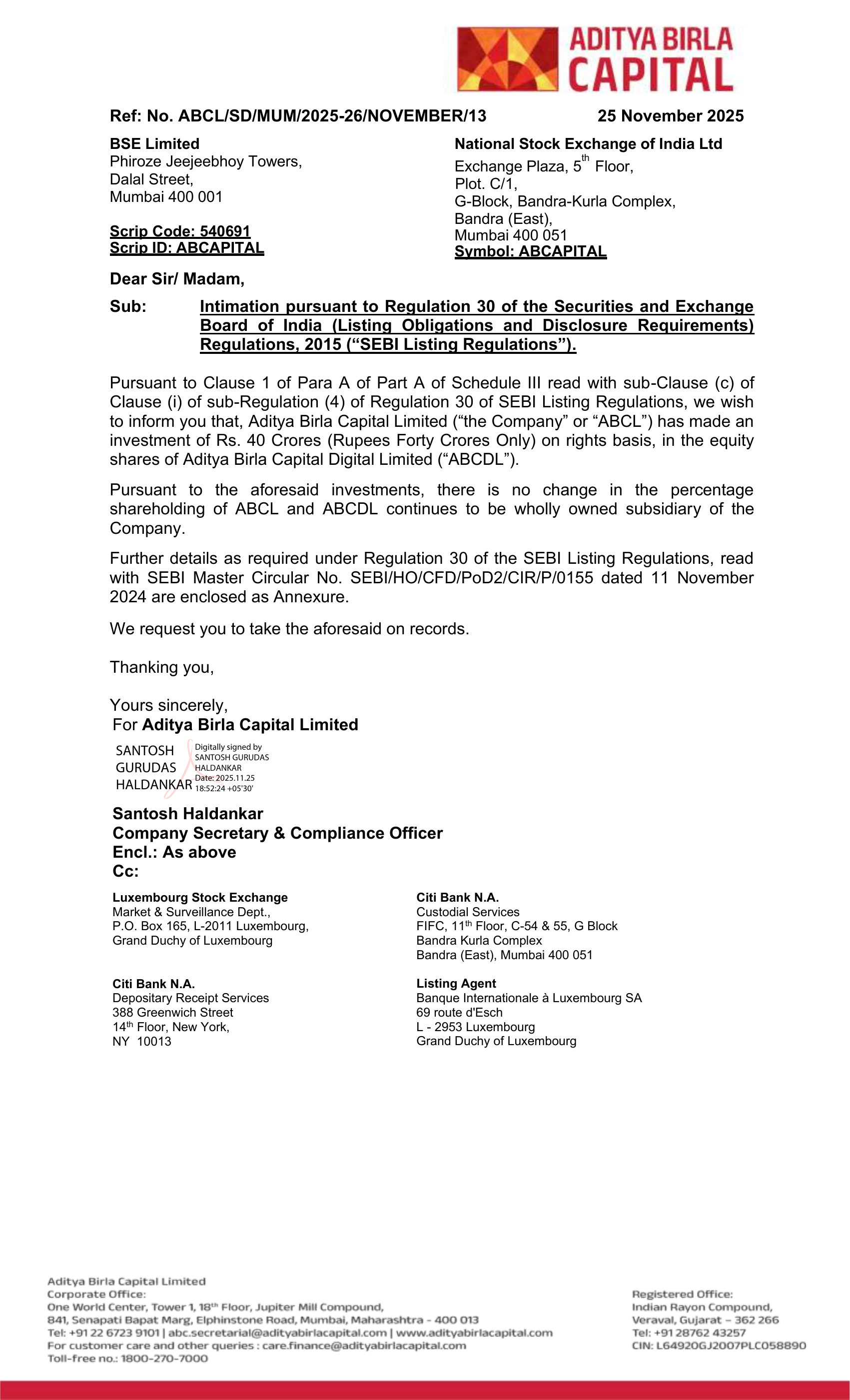 Aditya Birla Capital Ltd. - Investment & Acquisition Update - Aditya Birla Capital Ltd. invested Rs. 40 crore on a rights basis in its subsidiary ABCDL. - The investment aims to support growth and funding needs. - No change in 100% ownership stake; transaction completed on 24 Nov 2025. - Considerat...