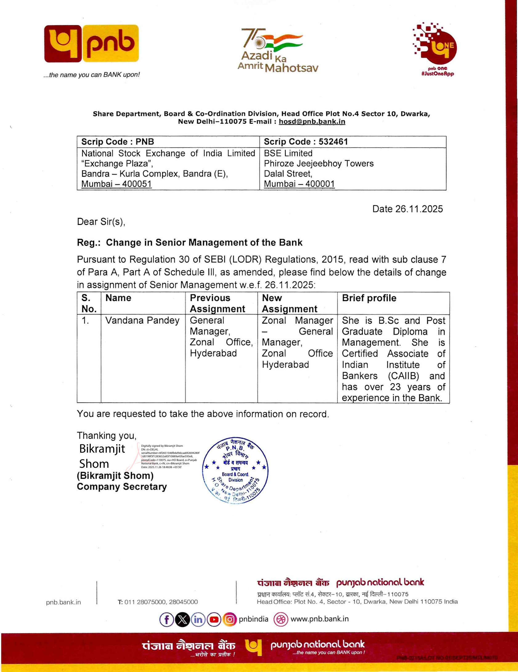 Punjab National Bank - Management Change Alert - Senior management change effective from Nov 26, 2025 - New Zonal Manager appointed for Hyderabad - Announcement complies with SEBI (LODR) Regulations, 2015 - Monitor potential impact on regional operations and strategic initiatives Original Filing: ...