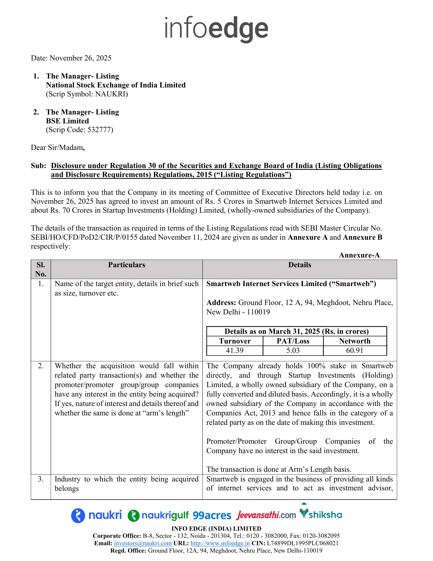 Info Edge (India) Ltd. Investment Announcement - Invests Rs. 5 crore in Smartweb Internet Services Limited (wholly-owned subsidiary) - Invests Rs. 70 crore in Startup Investments (Holding) Limited (wholly-owned subsidiary) - Acquires 5,00,000 CCDs in Smartweb and 2,916,666 CCDs in SIHL - Post-inves...
