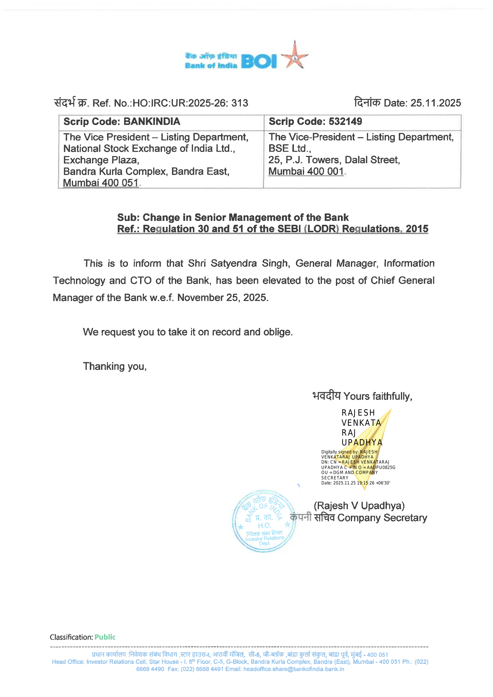 Bank of India Management Update - Satyendra Singh Promoted to Chief General Manager - Shri Satyendra Singh promoted to Chief General Manager, effective Nov 25, 2025. - Previously served as General Manager of IT and CTO. - Announcement made via NSE and BSE disclosures. - Indicates senior management ...