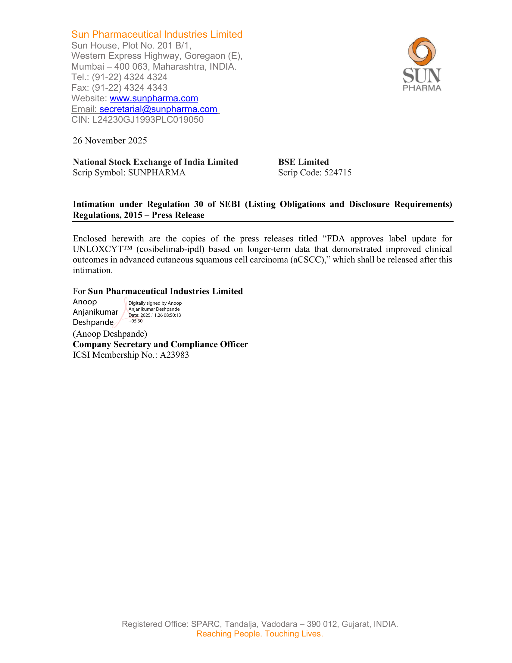 Sun Pharmaceutical Industries Ltd. - UNLOXCYT FDA Approval & Launch Plan - FDA approved updated label for UNLOXCYT™ (cosibelimab-ipdl) based on long-term data. - Demonstrates improved outcomes in advanced cutaneous squamous cell carcinoma (aCSCC). - Results from CK-301-101 trial show ≥50% objective...