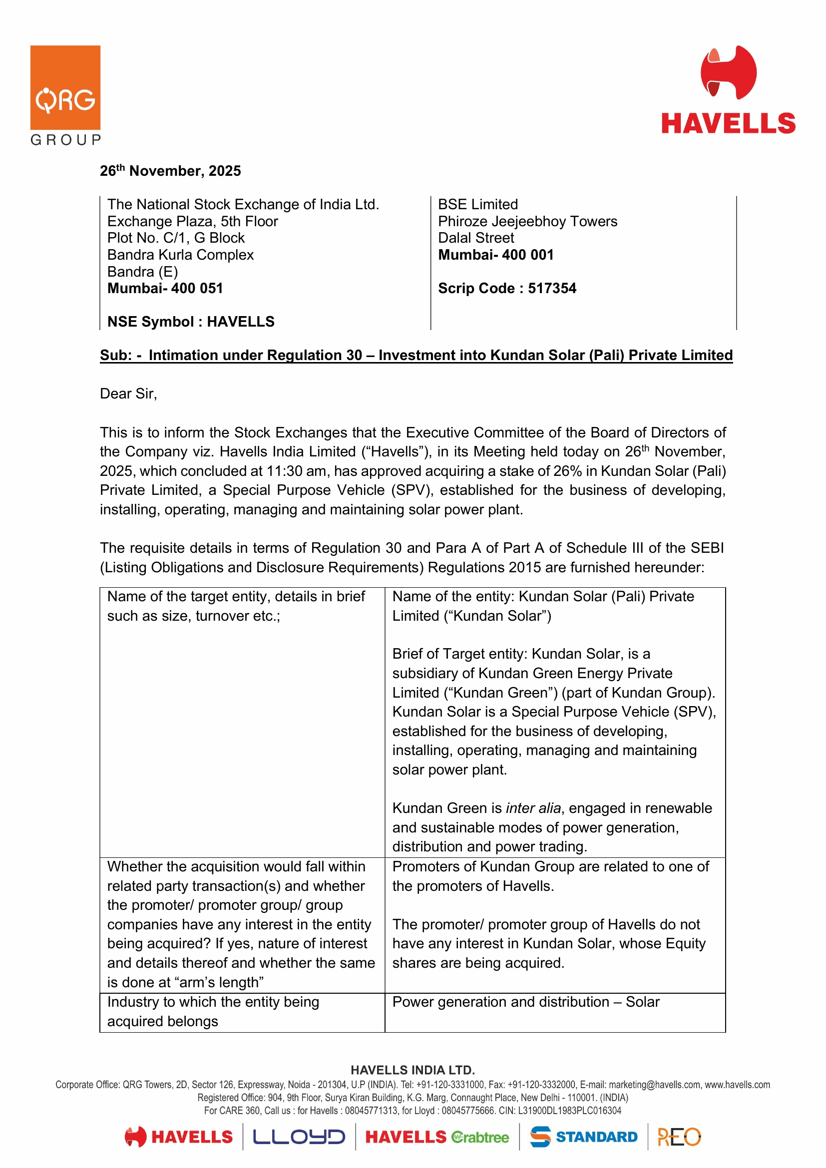 Havells India Ltd. Acquires Stake in Kundan Solar to Boost Green Energy - Havells India Ltd. acquires 26% stake in Kundan Solar (Pali) for INR 5.63 crore. - Investment to fund a 15 MWac solar plant, expected to complete by June 2026. - Long-term PPA of up to 25 years to secure energy supply. - Stra...