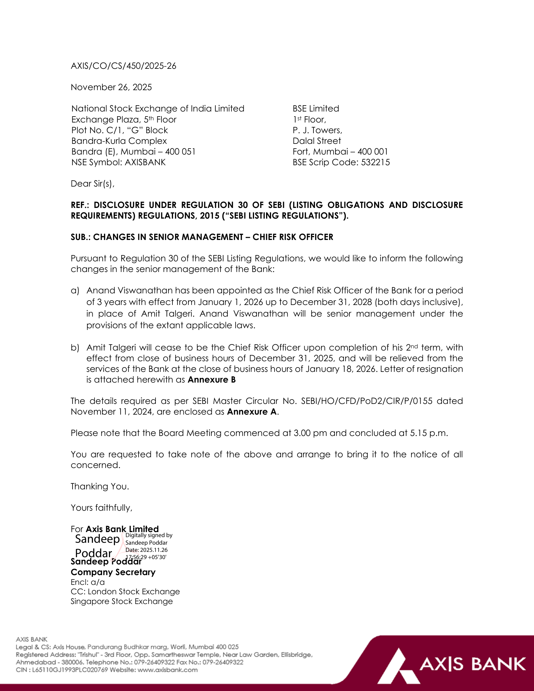 Axis Bank Ltd. - Senior Management Change Alert - Anand Viswanathan appointed as new Chief Risk Officer (CRO), effective January 1, 2026, for a three-year term. - Succeeds Amit Talgeri, who will step down by December 31, 2025. - Viswanathan currently leads Market, Liquidity Risk, ERM, and Model Ris...