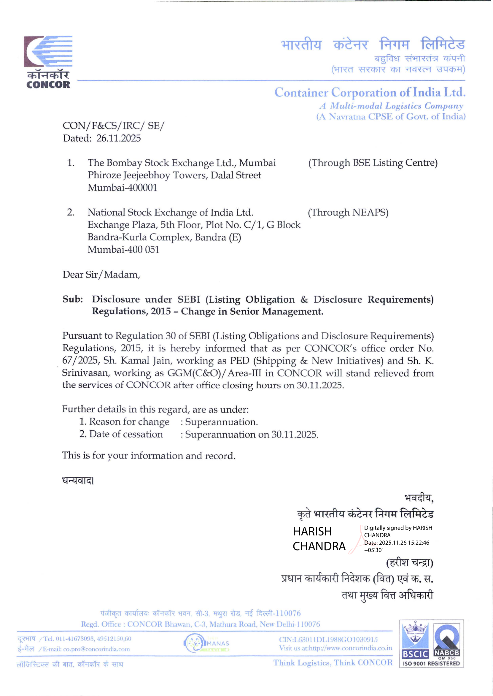 Container Corporation of India Ltd. - Leadership Transition Alert - Two senior executives, Kamal Jain and K. Srinivasan, are retiring after office hours on 30.11.2025. - Their superannuation marks a leadership transition. - Announcement complies with SEBI regulations. - Stakeholders should monitor ...