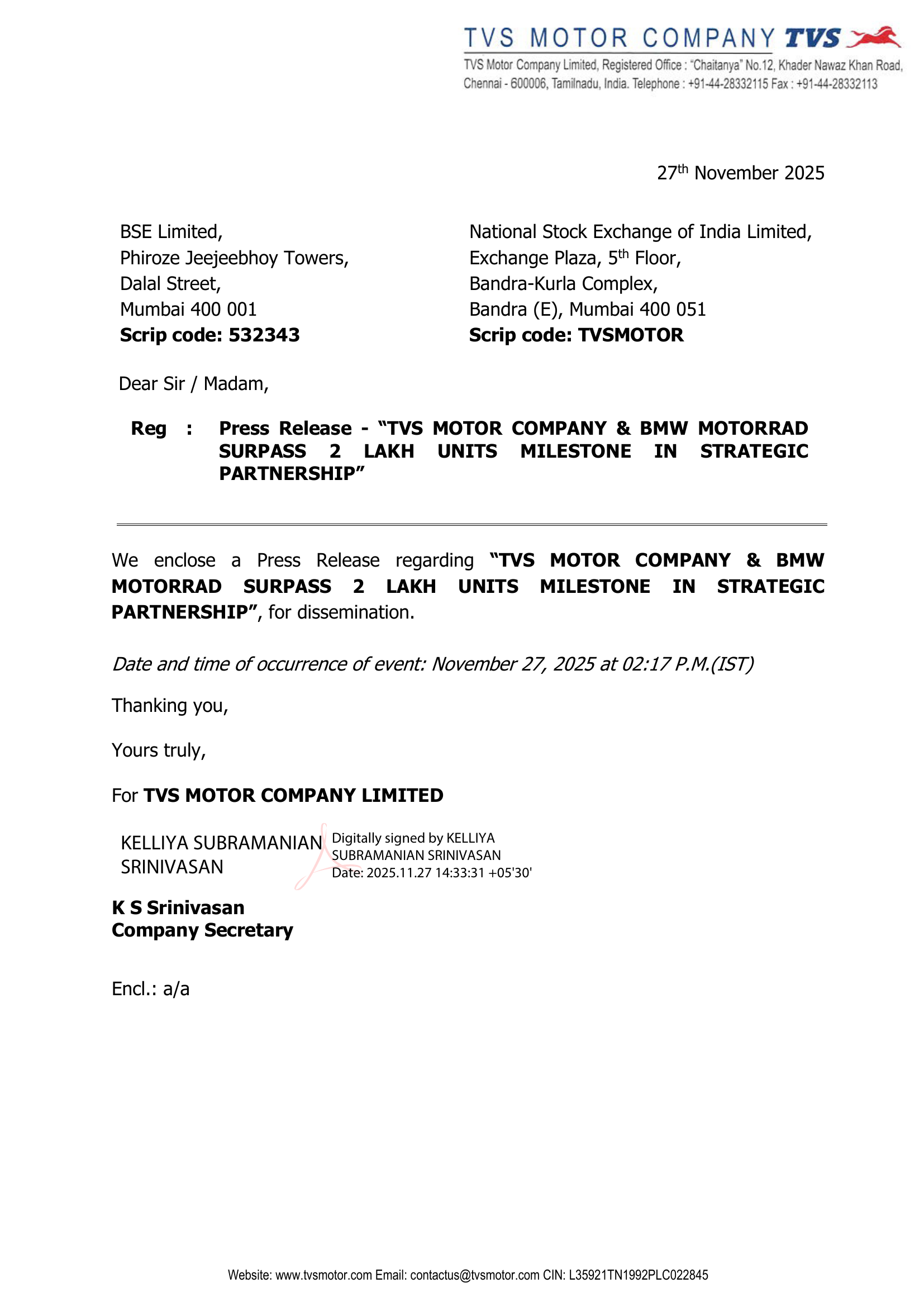 TVS Motor Company Ltd. - Strategic Partnership Milestone with BMW Motorrad - TVS Motor Company and BMW Motorrad surpass 200,000 units in partnership since 2013. - Launch of BMW F 450 GS at TVS's Hosur plant marks key milestone. - BMW Motorrad sold over 210,000 motorcycles in 2024. - Partnership emp...