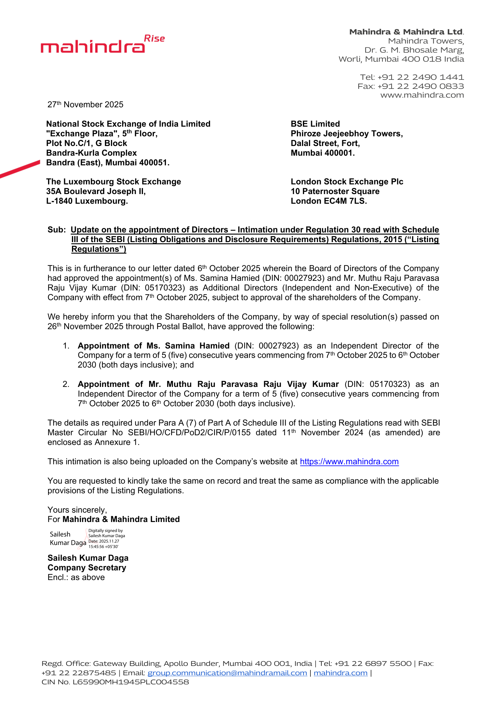 Mahindra & Mahindra Ltd. - New Independent Directors Appointed - Shareholders approved the appointment of Ms. Samina Hamied and Mr. Muthu Raju Paravasa Raju Vijay Kumar as independent directors for 5-year terms. - Appointments are effective from 7th October 2025 to 6th October 2030. - Ms. Hamied br...