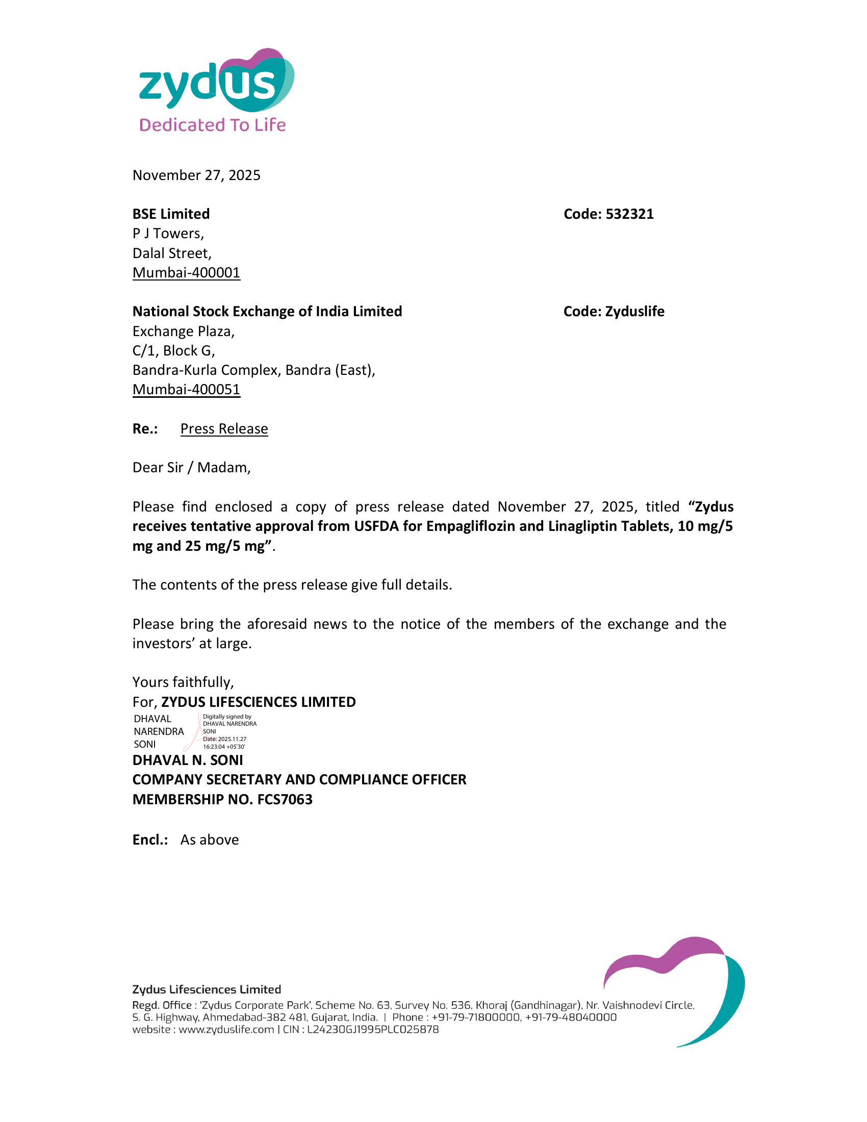 Zydus Lifesciences Ltd. Receives USFDA Tentative Approval for Diabetes Combination Tablets - Zydus Lifesciences Ltd. announced tentative USFDA approval for Empagliflozin and Linagliptin Tablets (10 mg/5 mg and 25 mg/5 mg). - Approved drugs are for glycaemic control in adults with type 2 diabetes, t...