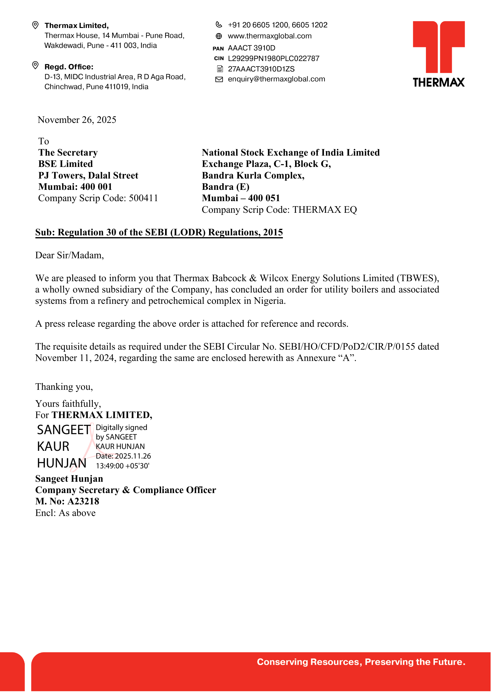 Thermax Ltd. Secures Rs. 580 Crore International Order from Dangote Industries - Thermax Ltd.'s subsidiary TBWES receives an order worth over Rs. 580 crore from Dangote Industries. - The order involves four 400 TPH oil & gas fired boilers for a refinery and petrochemical complex in Nigeria. - Scope...