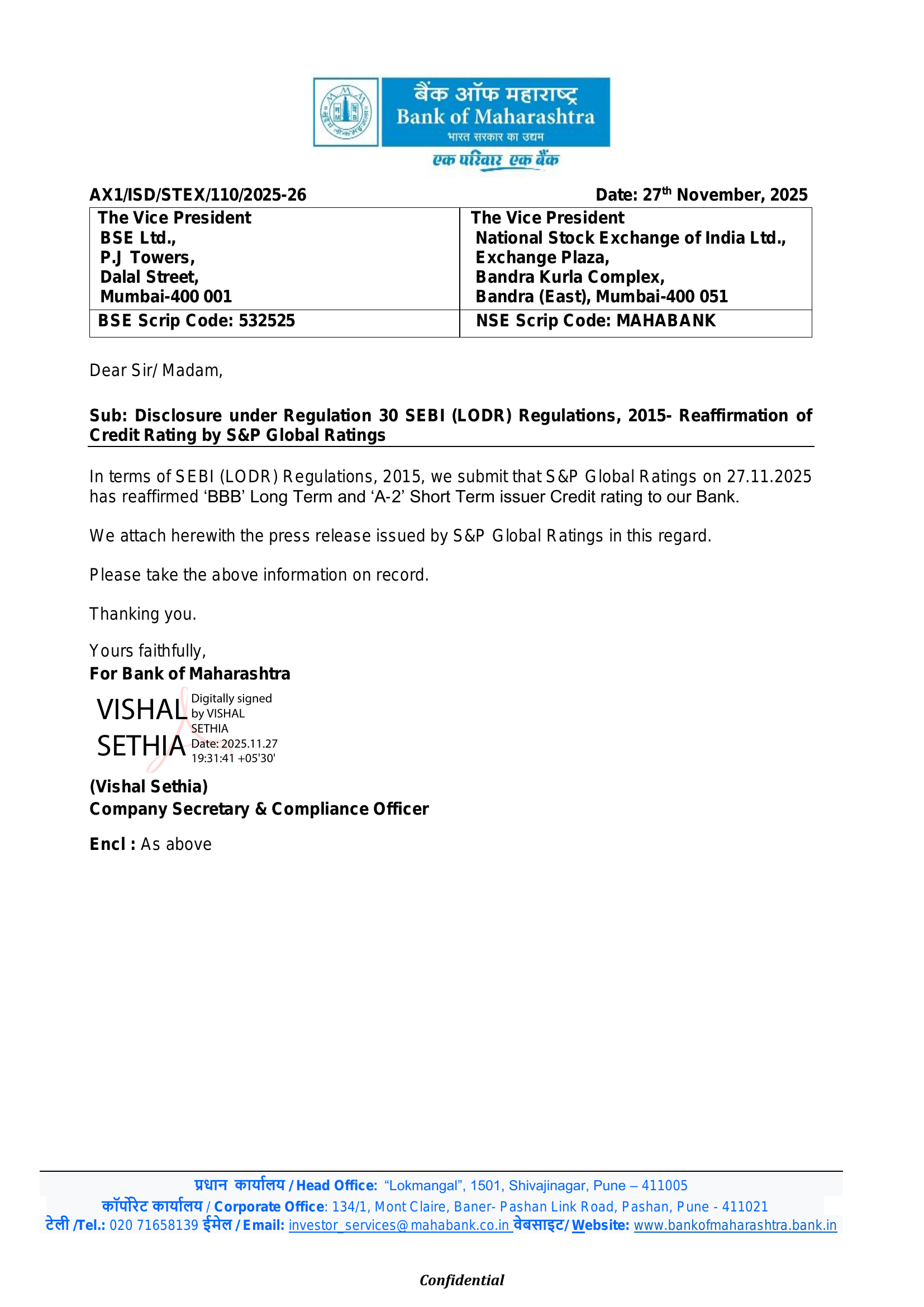 Bank of Maharashtra Credit Ratings Reaffirmed by S&P Global Ratings - S&P Global Ratings reaffirmed Bank of Maharashtra's credit ratings on 27.11.2025. - Long Term issuer rating maintained at ‘BBB’. - Short Term rating maintained at ‘A-2’. - No changes to ratings; reaffirmation indicates stable out...
