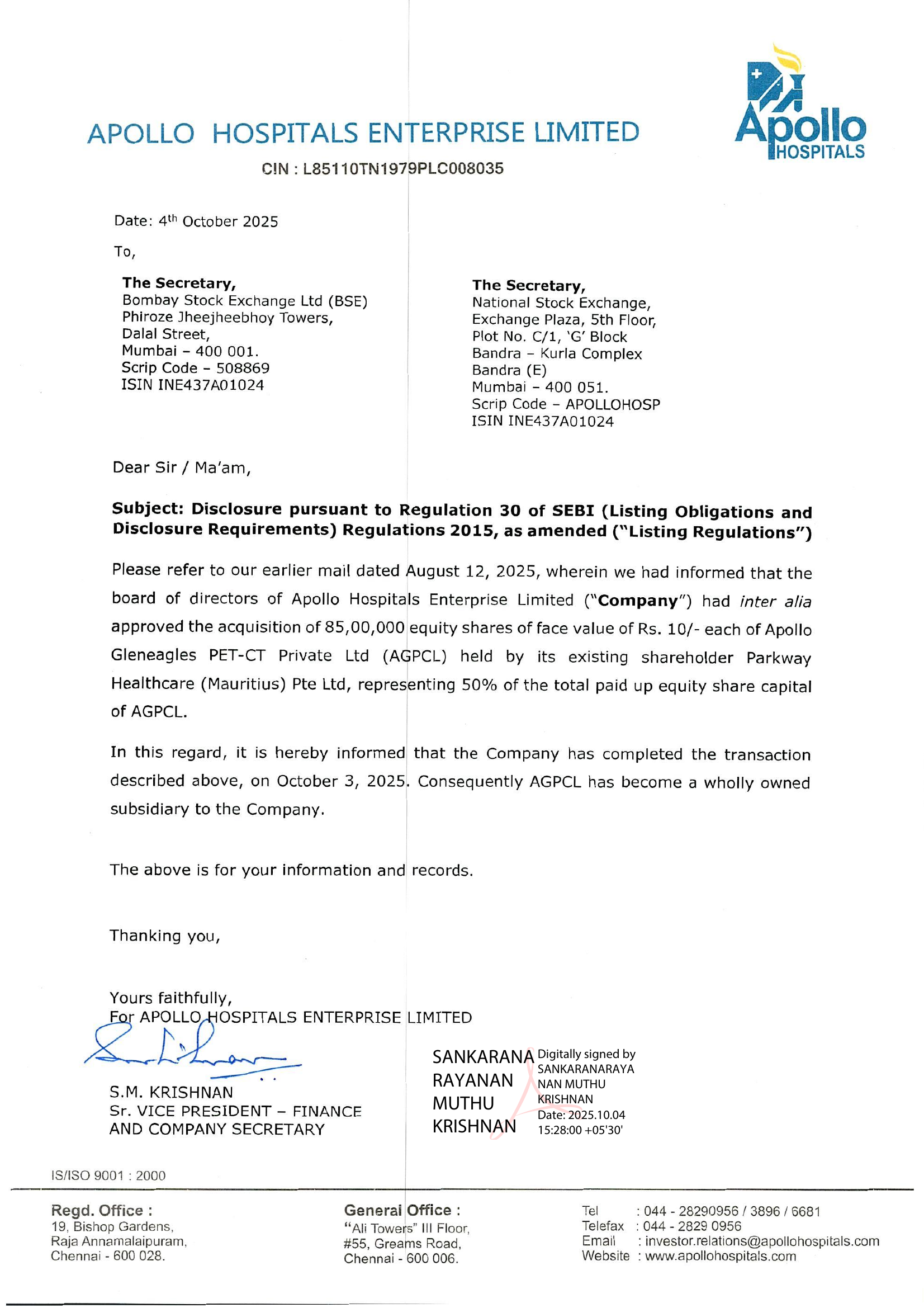 Apollo Hospitals Completes Acquisition of AGPCL Apollo Hospitals has acquired a 50% stake in AGPCL, making it a wholly owned subsidiary. This strategic move was finalized on October 3, 2025, following prior disclosures. Investors should review the detailed disclosures for impact analysis. Original Filing: www.bseindia.com/stock... $APOLLOHOSP.NSE