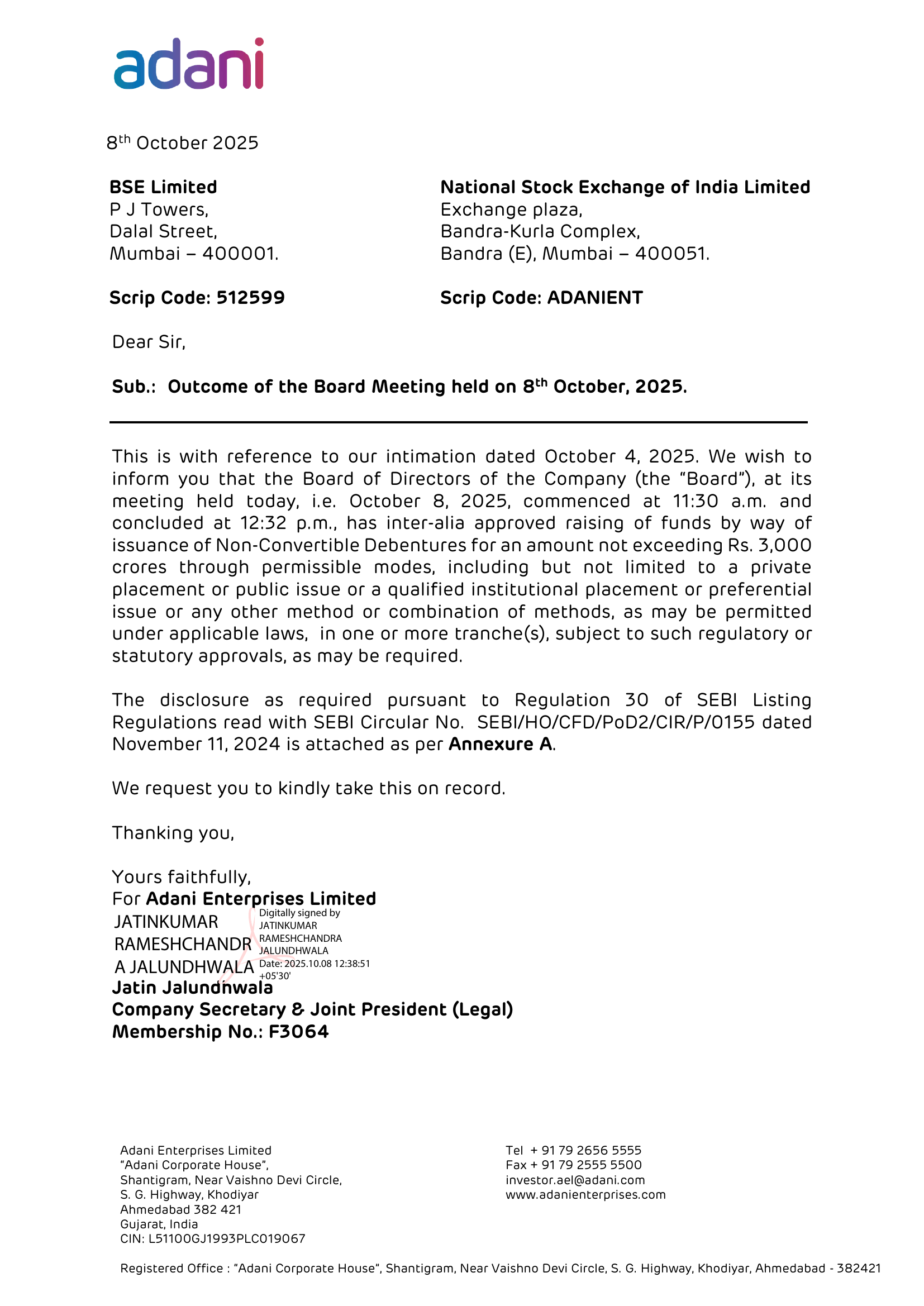 Adani Enterprises Plans Rs. 3,000 Crore NCD Issue Adani Enterprises has approved raising up to Rs. 3,000 crore through Non-Convertible Debentures via multiple modes, subject to regulatory approvals. Details such as tenure and coupon rate will be decided later. Monitoring recommended for potential impact on credit profile and stock performance. Original Filing: www.bseindia.com/stock... $ADANIENT.NSE