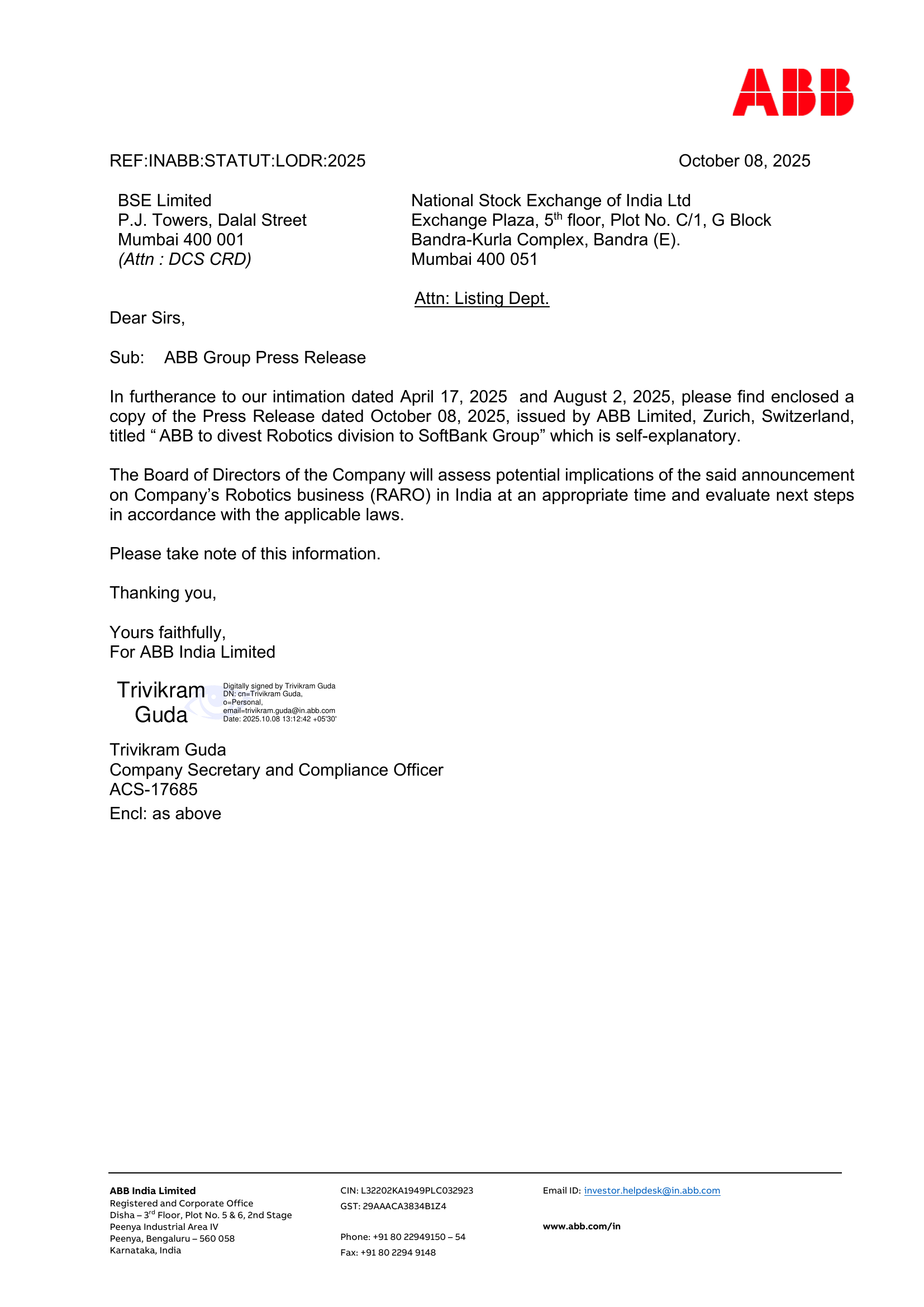 ABB Divests Robotics Division to SoftBank for $5.375B ABB announces the sale of its Robotics division to SoftBank Group for $5.375 billion, expected to close by late 2026. The division, with $2.3B revenue in 2024, will be reported as discontinued operations from Q4 2025. The transaction is projected to generate a $2.4B pre-tax gain and $5.3B cash proceeds, with $200M in separation costs. The proceeds will support ABB's focus on electrification and automation. Original Filing: www.bseindia.com/stock... $ABB.NSE