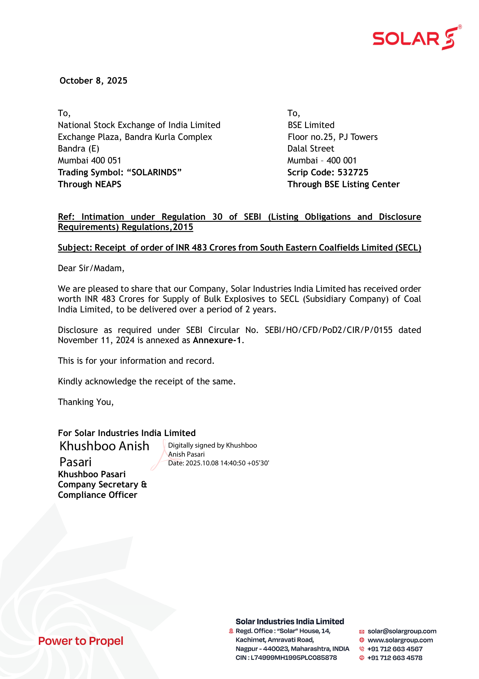 Solar Industries Secures INR 483 Crore Order from SECL Solar Industries India Limited has received a INR 483 crore order from South Eastern Coalfields Limited for bulk explosives supply over two years. This domestic, non-related-party contract highlights strong demand and growth prospects. Original Filing: www.bseindia.com/stock... $SOLARINDS.NSE
