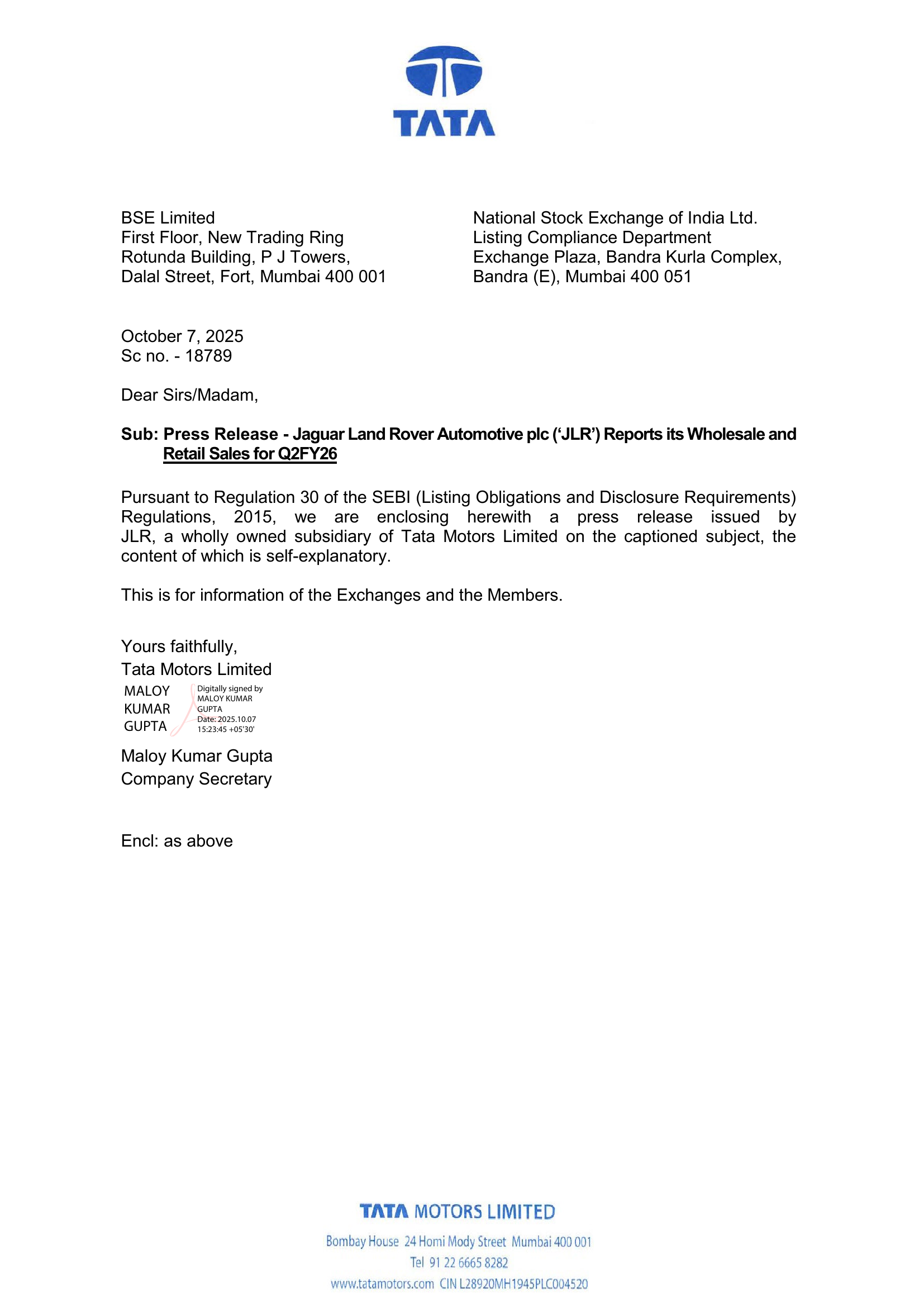 JLR Q2 FY26 Sales Drop Amid Cyber Incident and Market Challenges Jaguar Land Rover reports a 24.2% decline in wholesale volumes and 17.1% in retail sales for Q2 FY26, impacted by a cyber incident, model phase-out, and US tariffs. Manufacturing is gradually restarting; full financials due in November. Original Filing: www.bseindia.com/stock... $TATAMOTORS.NSE