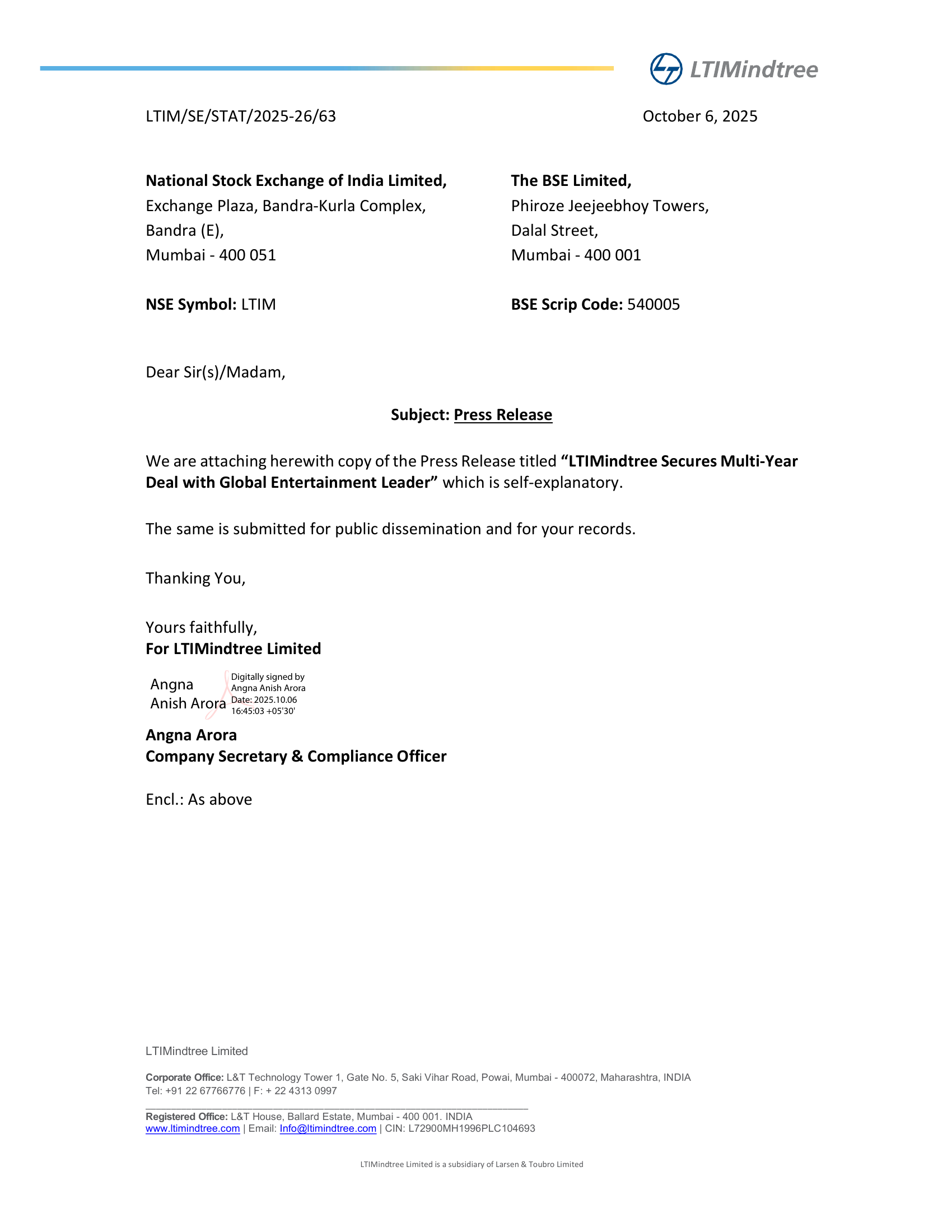 LTIMindtree Secures Largest Deal with Global Media Client LTIMindtree announced a multi-year strategic deal with a leading global media and entertainment company to support digital transformation, automation, and process optimization, marking its largest deal to date. Original Filing: www.bseindia.com/stock... $LTIM.NSE
