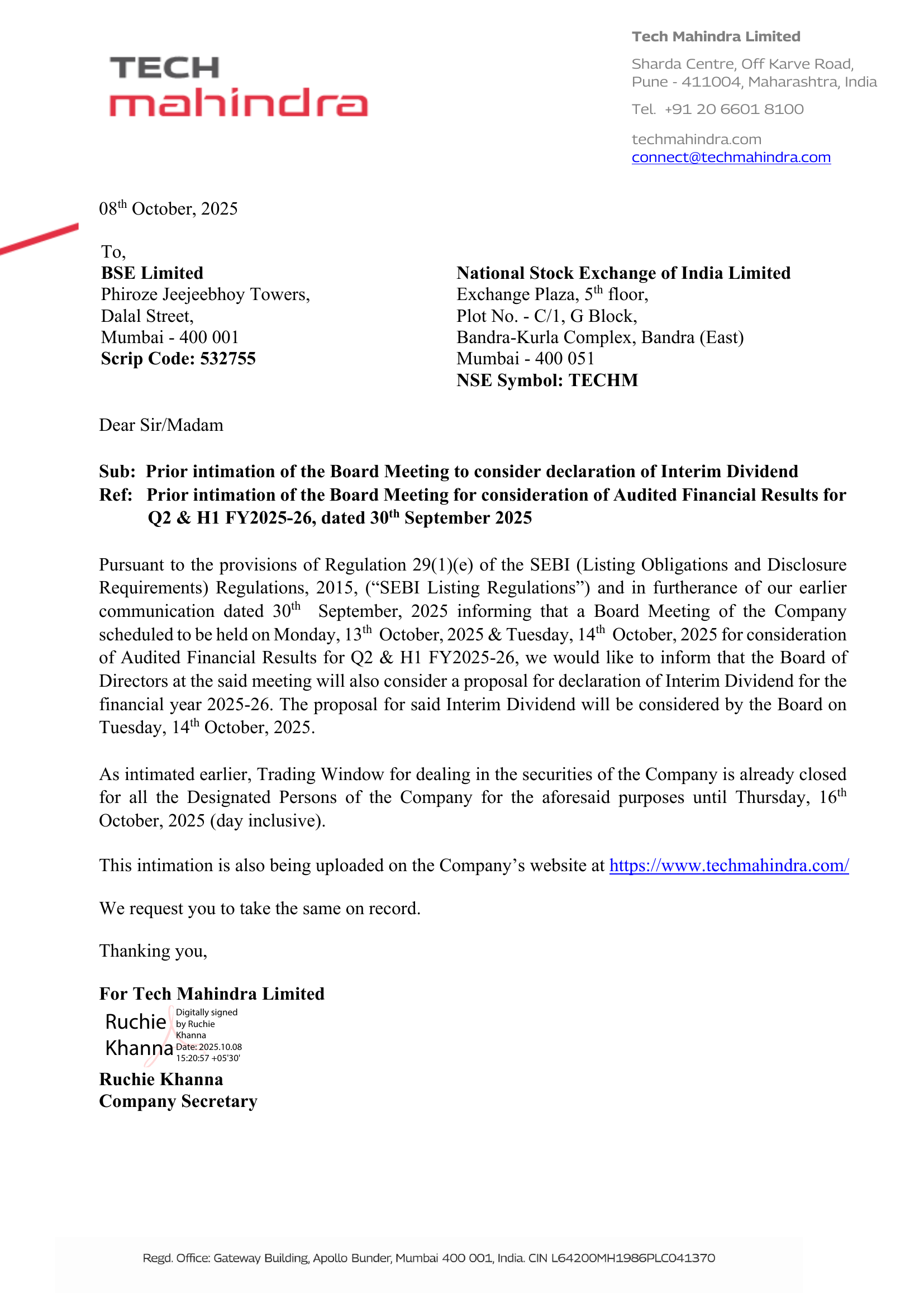Tech Mahindra Board Meeting & Dividend Announcement Tech Mahindra Limited's Board will meet on October 14, 2025, to approve the interim dividend for FY2025-26 and review Q2 and H1 FY2025-26 financial results. Trading window remains closed until October 16, 2025. Original Filing: www.bseindia.com/stock... $TECHM.NSE