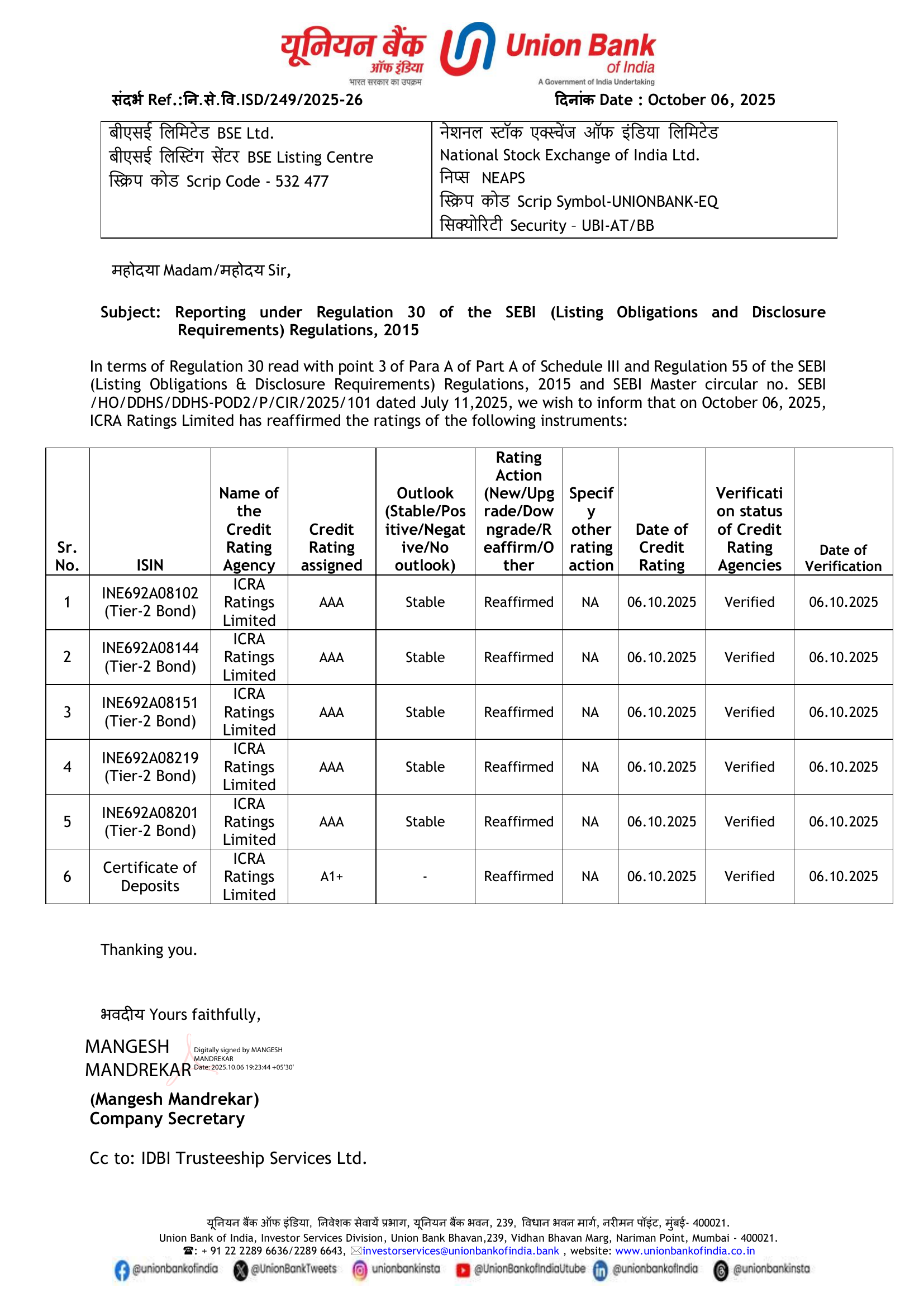 Union Bank of India Credit Ratings Reaffirmed by ICRA ICRA has reaffirmed Union Bank of India's Basel III Tier II bonds at AAA (Stable) and certificates of deposit at A1+. The rating for a Rs. 1,000 crore Tier II bond has been withdrawn following full redemption. The bank's ratings are supported by its strong systemic position, healthy capital buffers, and stable asset quality, despite some asset quality concerns amid macroeconomic uncertainties. The bank reported a net profit of Rs. 4,116 crore in Q1 FY2026 and total assets of Rs. 14.82 lakh crore as of June 30, 2025. Original Filing: www.bseindia.com/stock... $UNIONBANK.NSE #CreditRating