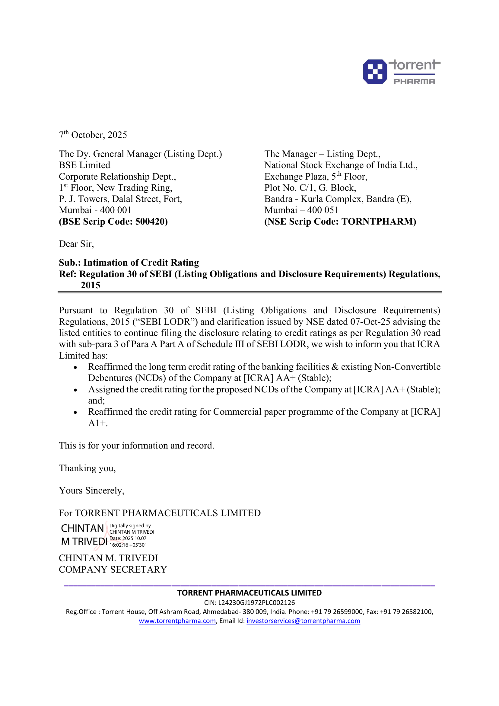 Torrent Pharmaceuticals Credit Rating Reaffirmation Torrent Pharmaceuticals' credit ratings reaffirmed at AA+ (Stable) for long-term facilities and A1+ for commercial paper by ICRA. No immediate concern; maintain monitoring. Original Filing: www.bseindia.com/stock... $TORNTPHARM.NSE #CreditRating