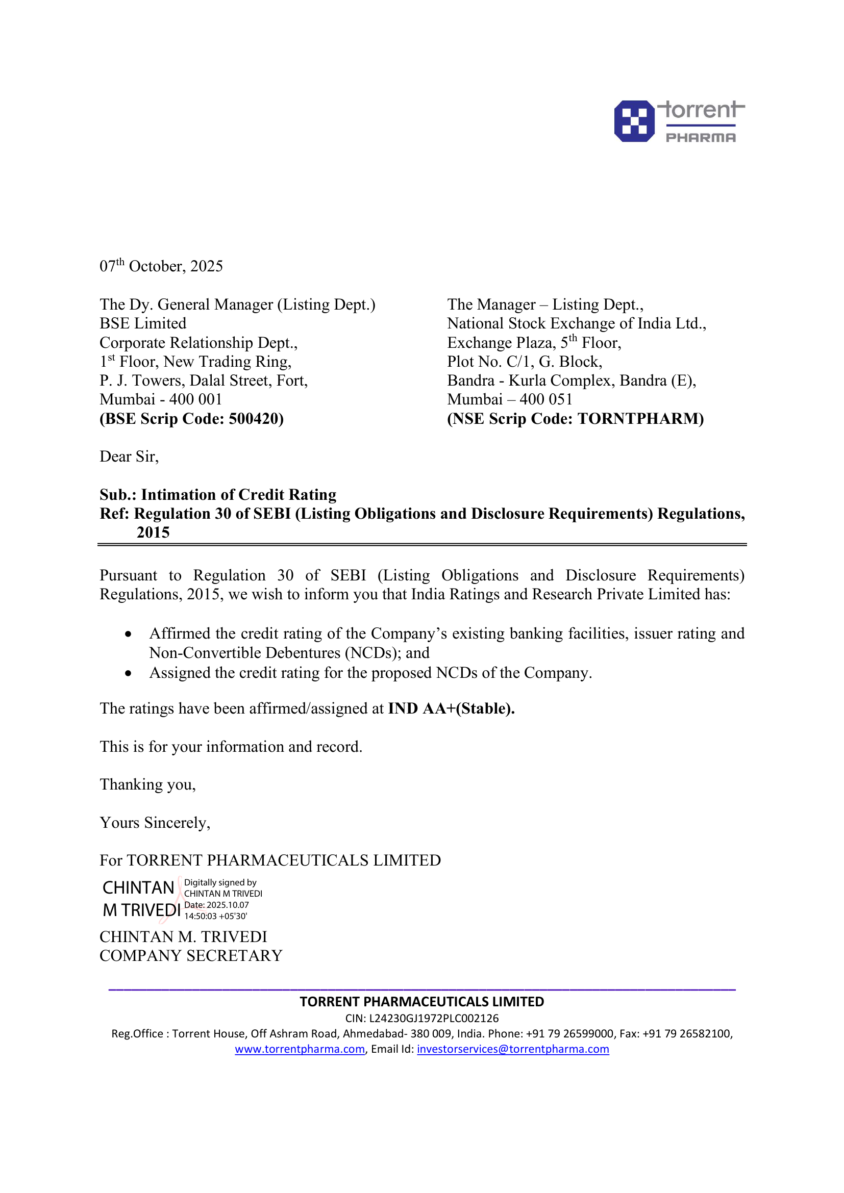 Torrent Pharmaceuticals Credit Rating Update India Ratings has affirmed Torrent Pharmaceuticals' credit ratings at IND AA+(Stable), including existing banking facilities, issuer rating, and NCDs. Proposed NCDs also rated IND AA+(Stable). No immediate action required; ratings remain stable. Original Filing: www.bseindia.com/stock... $TORNTPHARM.NSE #CreditRating