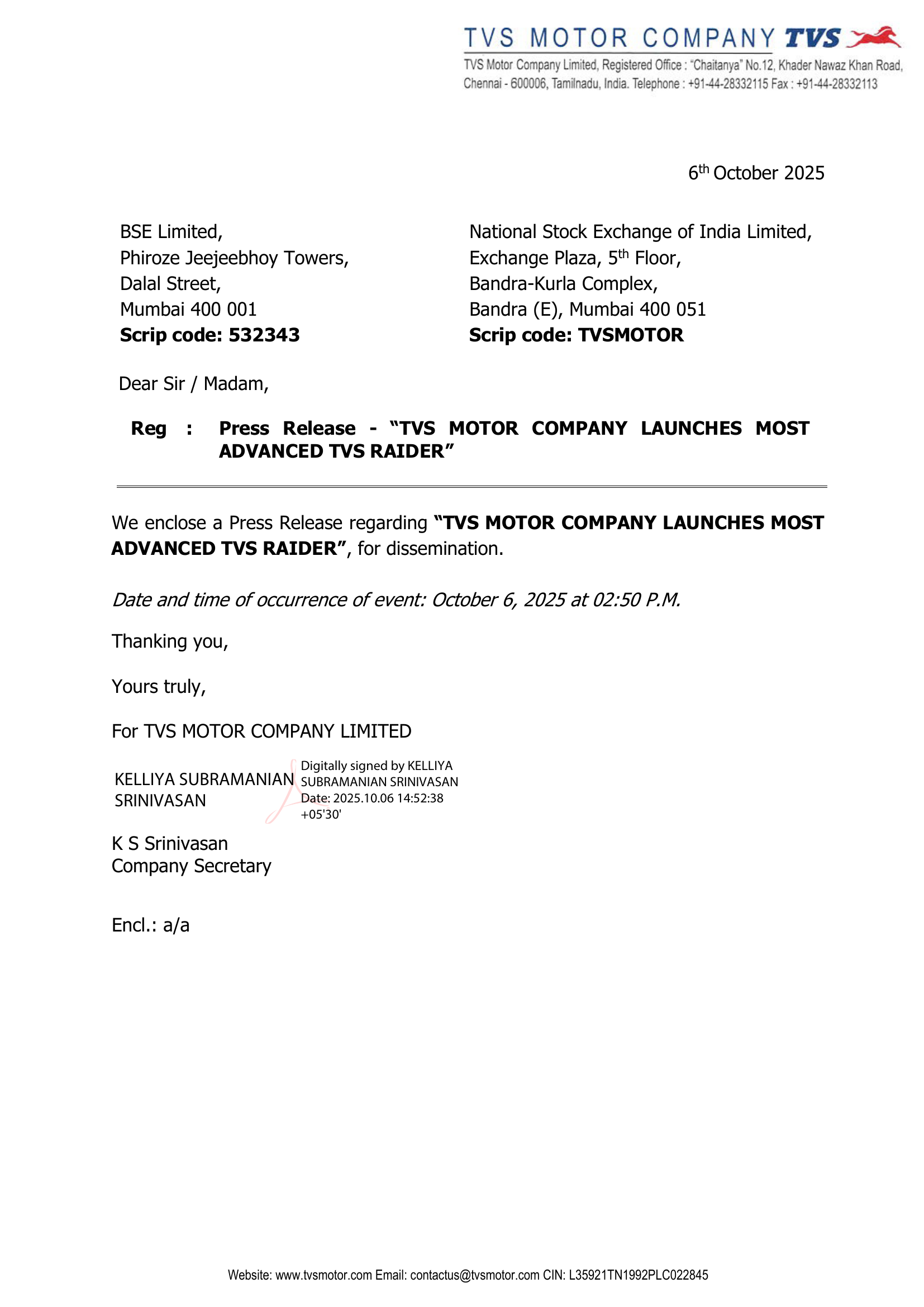 TVS Motor Launches Innovative TVS Raider TVS Motor Company has launched the new TVS Raider, featuring advanced technologies like Boost Mode with iGO Assist, dual disc brakes with ABS, and GTT. Priced from ₹93,800, it aims to strengthen its segment presence. Monitor for potential positive impact on sales and market share. Original Filing: www.bseindia.com/stock... $TVSMOTOR.NSE