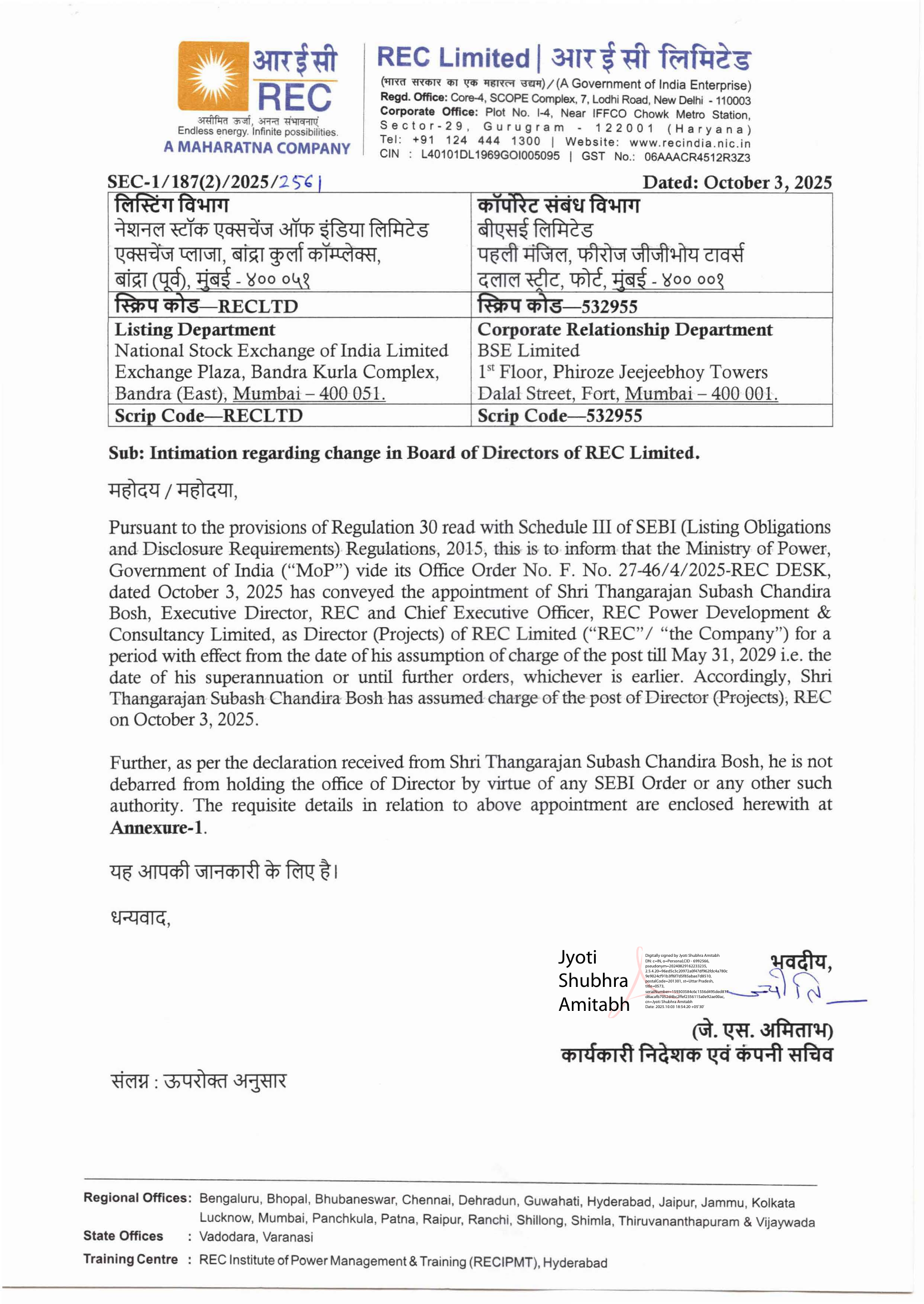 REC Limited Appoints New Director (Projects) REC Limited has appointed Shri Thangarajan Subash Chandira Bosh as Director (Projects), effective October 3, 2025, with a term until May 31, 2029. Shri Bosh brings over 35 years of experience in the power sector and is currently CEO of REC Power Development & Consultancy Limited. Original Filing: www.bseindia.com/stock... $RECLTD.NSE #ManagementChange