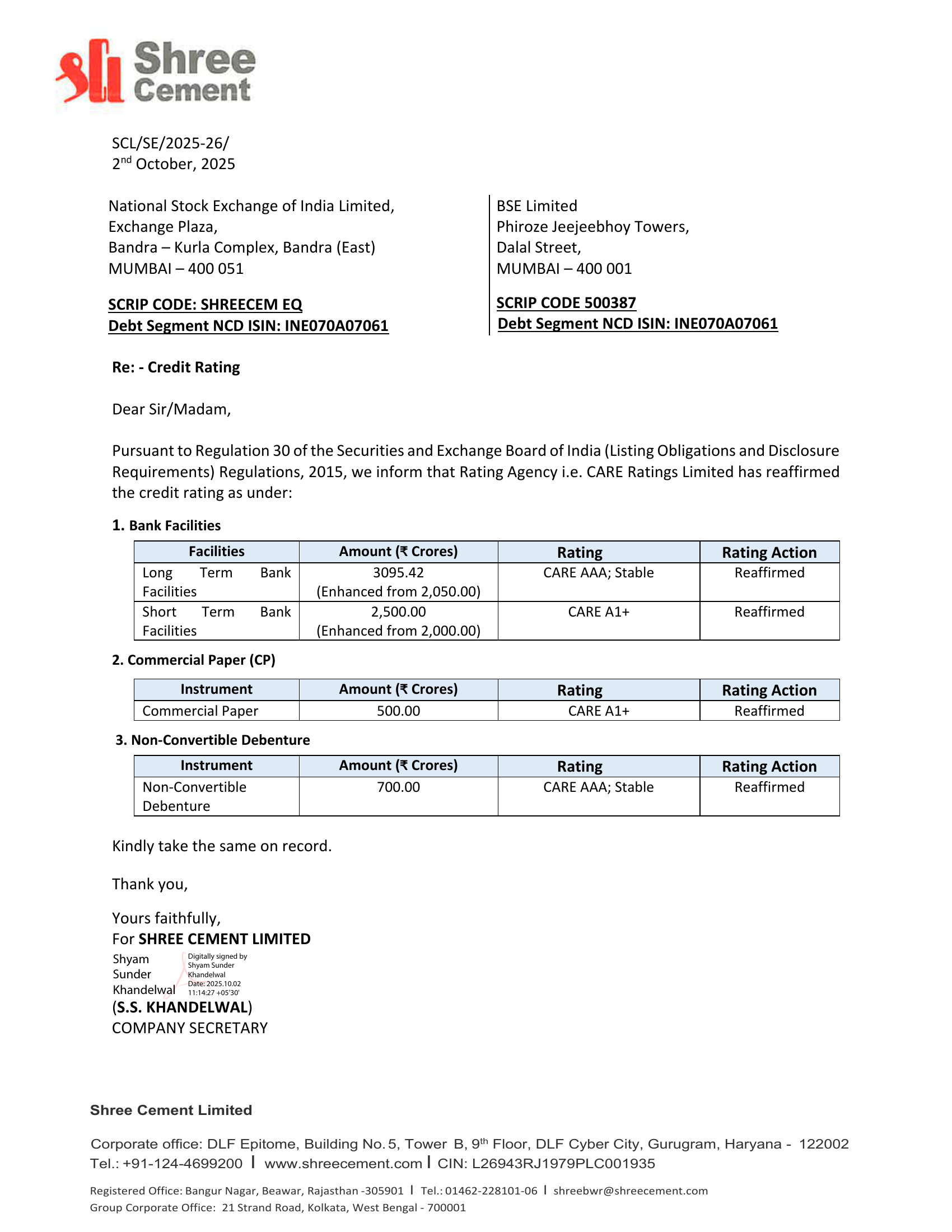 Shree Cement Ratings Reaffirmed and Enhanced Shree Cement Limited's credit ratings have been reaffirmed by CRISIL, with an upgrade in total rated bank facilities to ₹4,500 crore. Long-term facilities remain AAA/Stable, short-term A1+, and non-convertible debentures AAA/Stable, reflecting strong creditworthiness and increased borrowing capacity. Original Filing: www.bseindia.com/stock... $SHREECEM.NSE #CreditRating