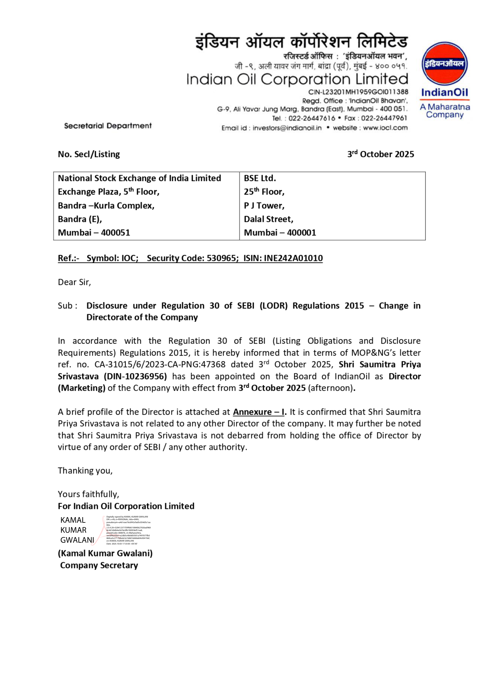 Indian Oil Appoints New Director (Marketing) Indian Oil Corporation Limited has appointed Shri Saumitra Priya Srivastava as Director (Marketing) effective October 3, 2025. With over 30 years of industry experience and a background in strategic leadership, he is expected to strengthen the company's marketing initiatives. Original Filing: www.bseindia.com/stock... $IOC.NSE #ManagementChange