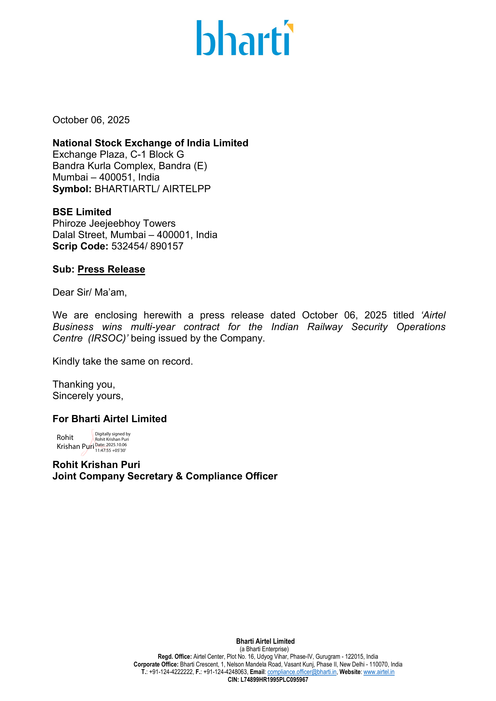 Bharti Airtel Secures Major Cybersecurity Contract for Indian Railways Bharti Airtel's Airtel Business has won a multi-year contract to develop and operate a comprehensive cybersecurity ecosystem for the Indian Railway Security Operations Centre (IRSOC). This initiative will enhance cybersecurity resilience across India's railway network, protecting critical infrastructure and data for over 1 billion citizens. Original Filing: www.bseindia.com/stock... $BHARTIARTL.NSE