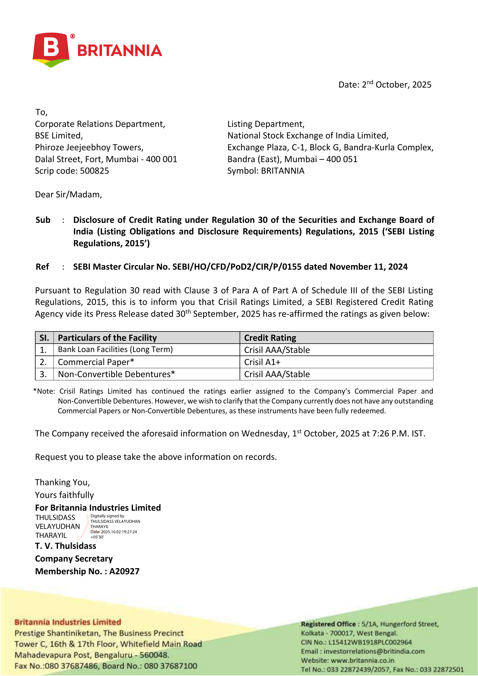 Britannia Ratings Reaffirmed by Crisil Crisil Ratings reaffirmed Britannia Industries' credit ratings: AAA/Stable for long-term bank facilities and non-convertible debentures, A1+ for commercial paper. No current outstanding commercial papers or debentures. Original Filing: www.bseindia.com/stock... $BRITANNIA.NSE #CreditRating