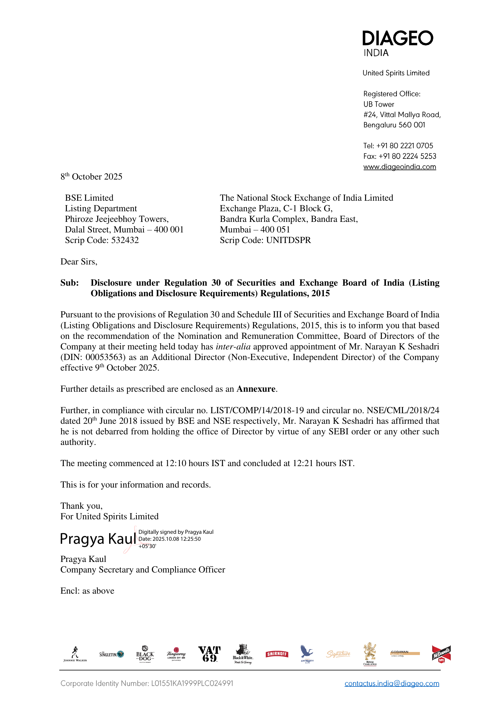 United Spirits Appoints New Independent Director United Spirits Limited has appointed Mr. Narayan K Seshadri as an Additional Non-Executive Independent Director, effective 9th October 2025, for a three-year term pending shareholder approval. Mr. Seshadri brings over 42 years of experience in finance and auditing. Original Filing: www.bseindia.com/stock... $UNITDSPR.NSE #ManagementChange