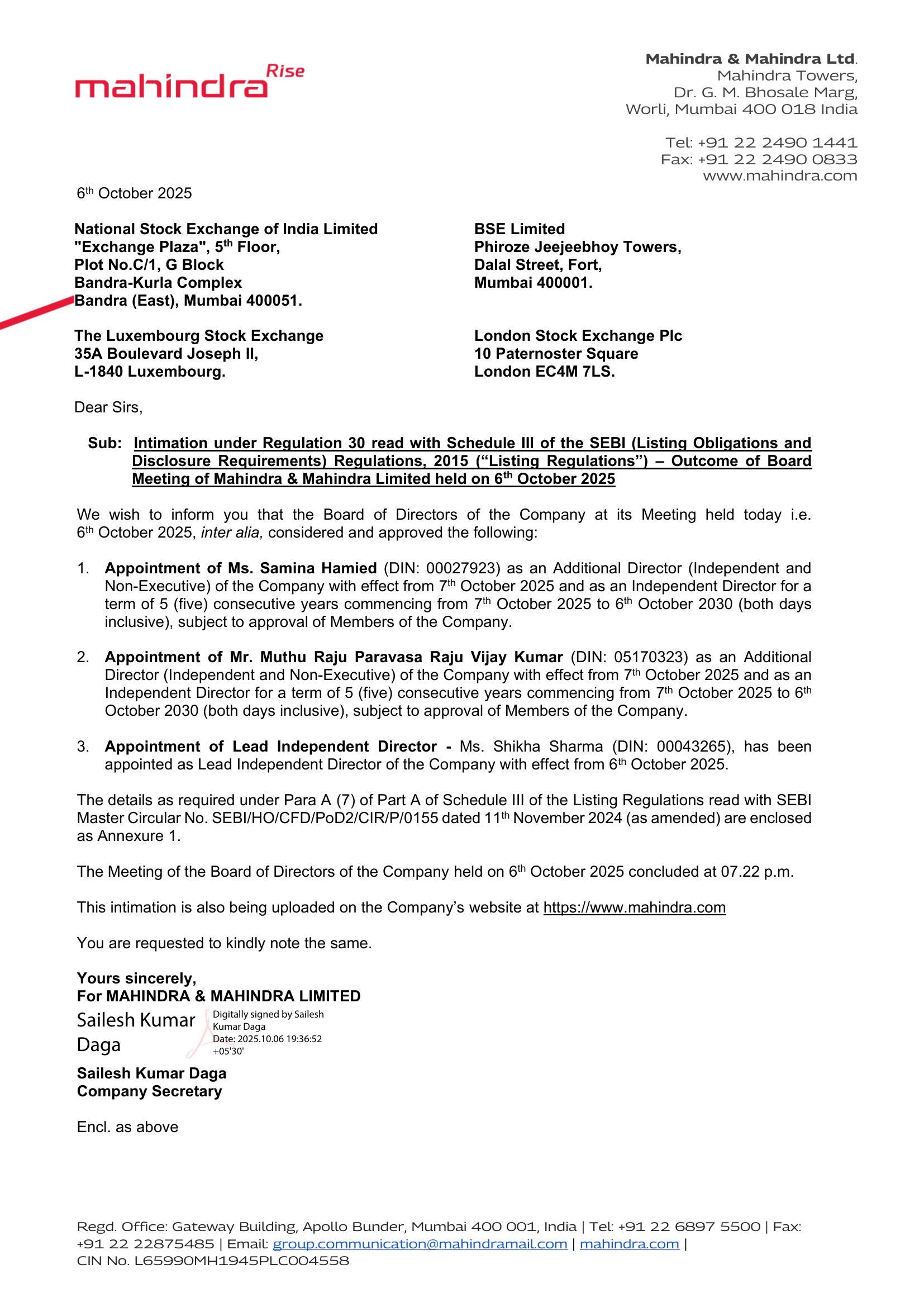 Mahindra & Mahindra Board Appointments Mahindra & Mahindra Ltd. announced new independent director appointments and a Lead Independent Director at the October 6, 2025, board meeting, pending shareholder approval. These changes may impact corporate governance and strategic oversight. Original Filing: www.bseindia.com/stock... $M&M.NSE #ManagementChange