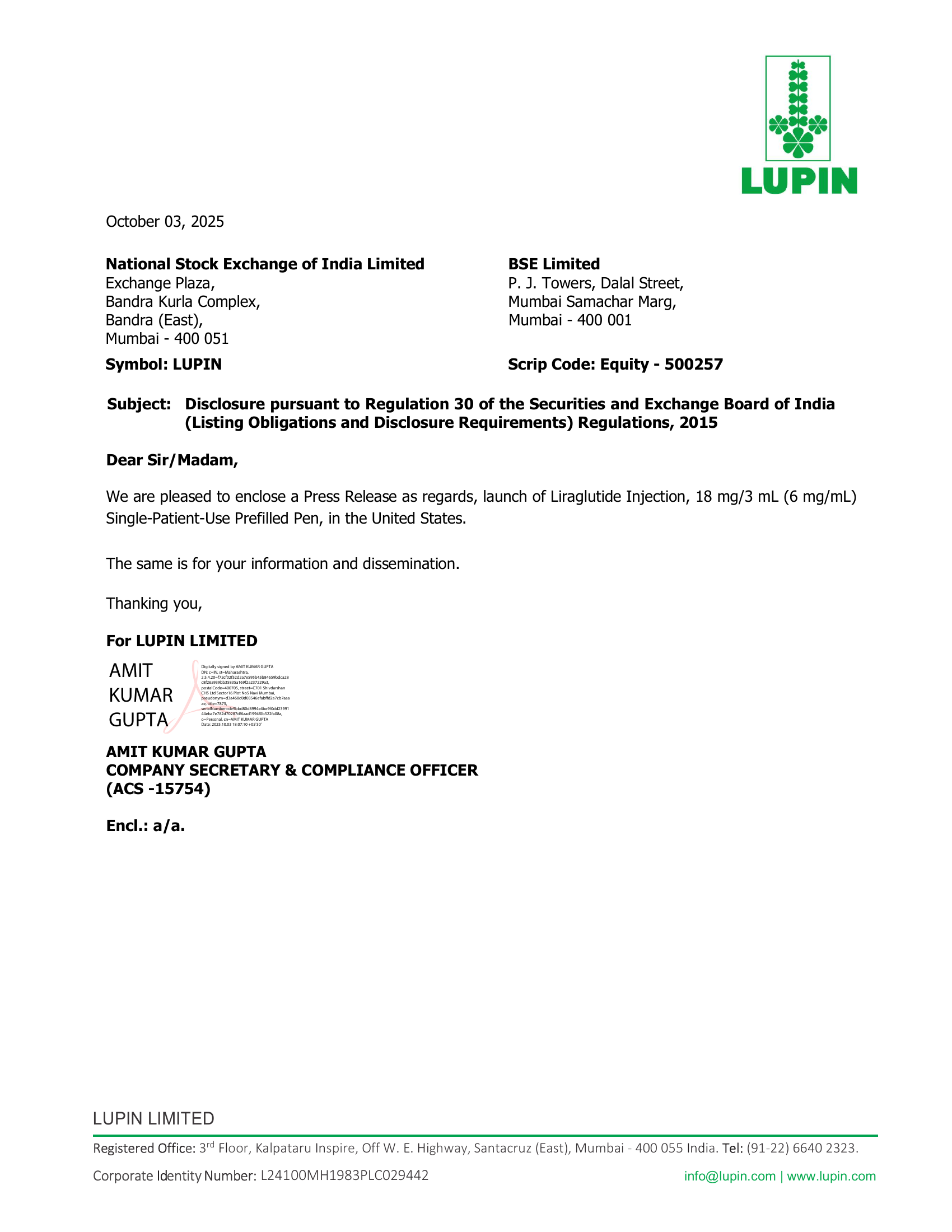 Lupin Launches Bioequivalent Liraglutide in US Lupin Limited has launched Liraglutide Injection, 18 mg/3 mL, in the US, targeting the type 2 diabetes market. The product is bioequivalent to Victoza®, which had USD 350M in US sales as of August 2025. This expansion highlights Lupin's growth in complex injectables and accessible therapies. Original Filing: www.bseindia.com/stock... $LUPIN.NSE