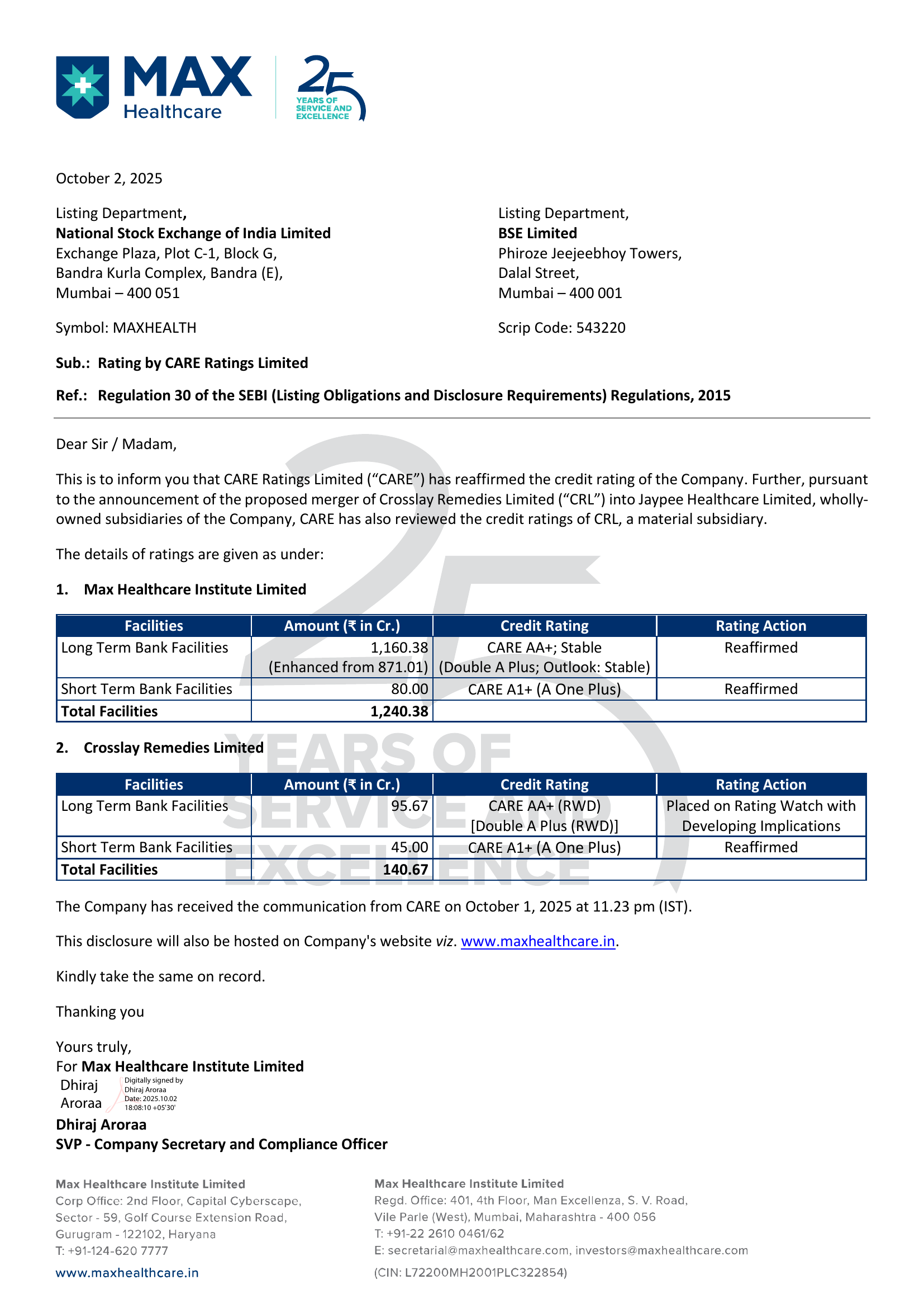 CARE Ratings Reaffirms Max Healthcare & Crosslay Ratings Amid Merger Plans CARE Ratings has reaffirmed Max Healthcare's long-term rating at CARE AA+ and short-term at CARE A1+. Crosslay Remedies' ratings are on Rating Watch with Developing Implications due to the proposed merger into Jaypee Healthcare Limited. Investors should monitor the merger developments for potential rating impacts. Original Filing: www.bseindia.com/stock... $MAXHEALTH.NSE #CreditRating