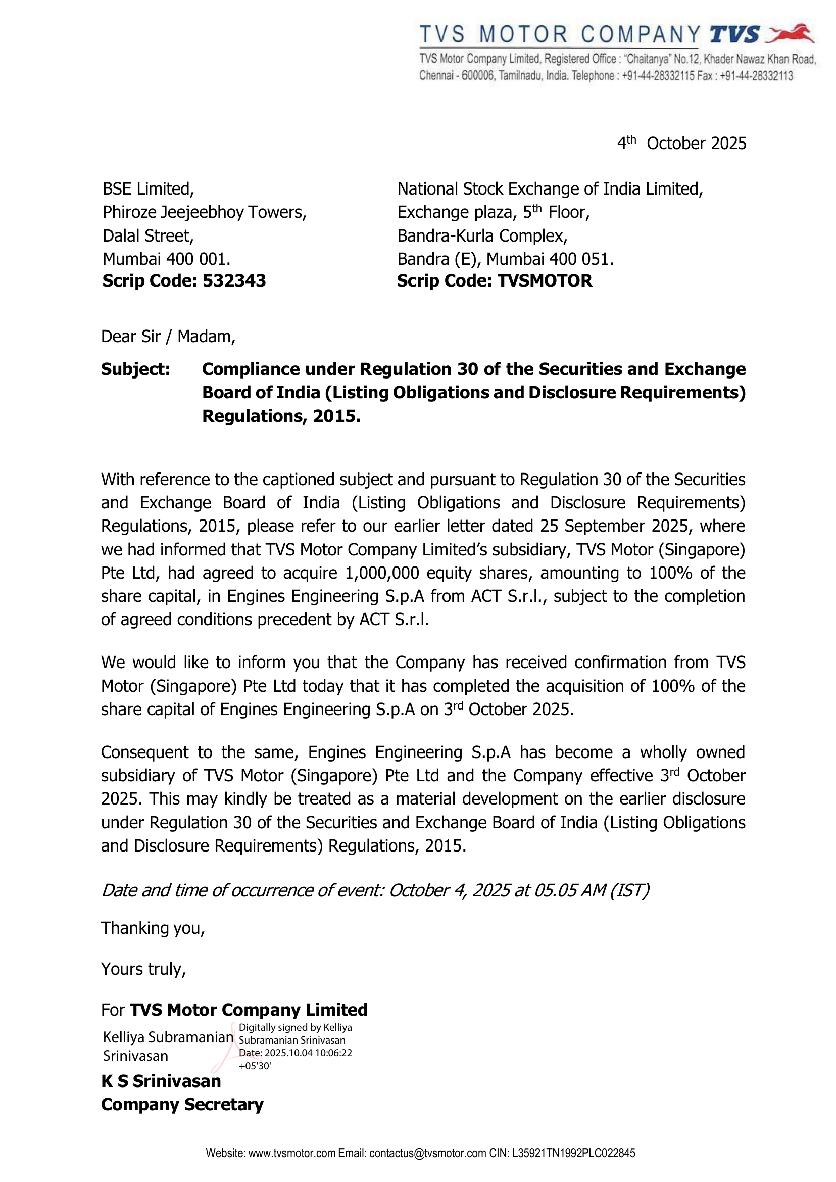 TVS Motor Completes Acquisition of Engines Engineering S.p.A. TVS Motor Company has finalized the acquisition of Engines Engineering S.p.A., making it a wholly owned subsidiary. This strategic move is a significant development for the company. Original Filing: www.bseindia.com/stock... $TVSMOTOR.NSE