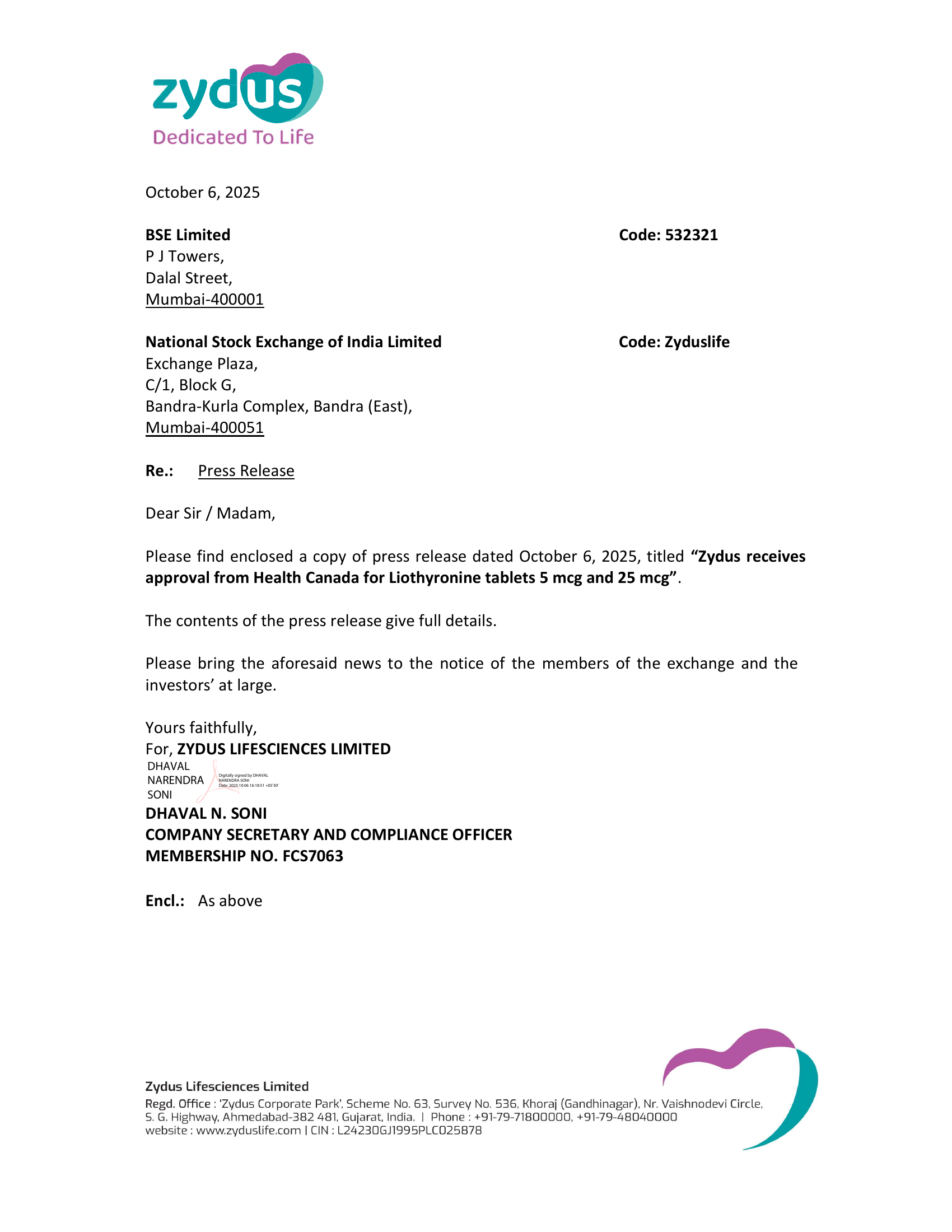 Zydus Lifesciences Receives Health Canada Approval for Liothyronine Tablets Zydus Lifesciences has received Health Canada's Notice of Compliance for its generic Liothyronine tablets (5 mcg and 25 mcg), with manufacturing at Ahmedabad SEZ. Canadian sales were approx. 10.9M CAD as of June 2025, potentially boosting revenue. Original Filing: www.bseindia.com/stock... $ZYDUSLIFE.NSE