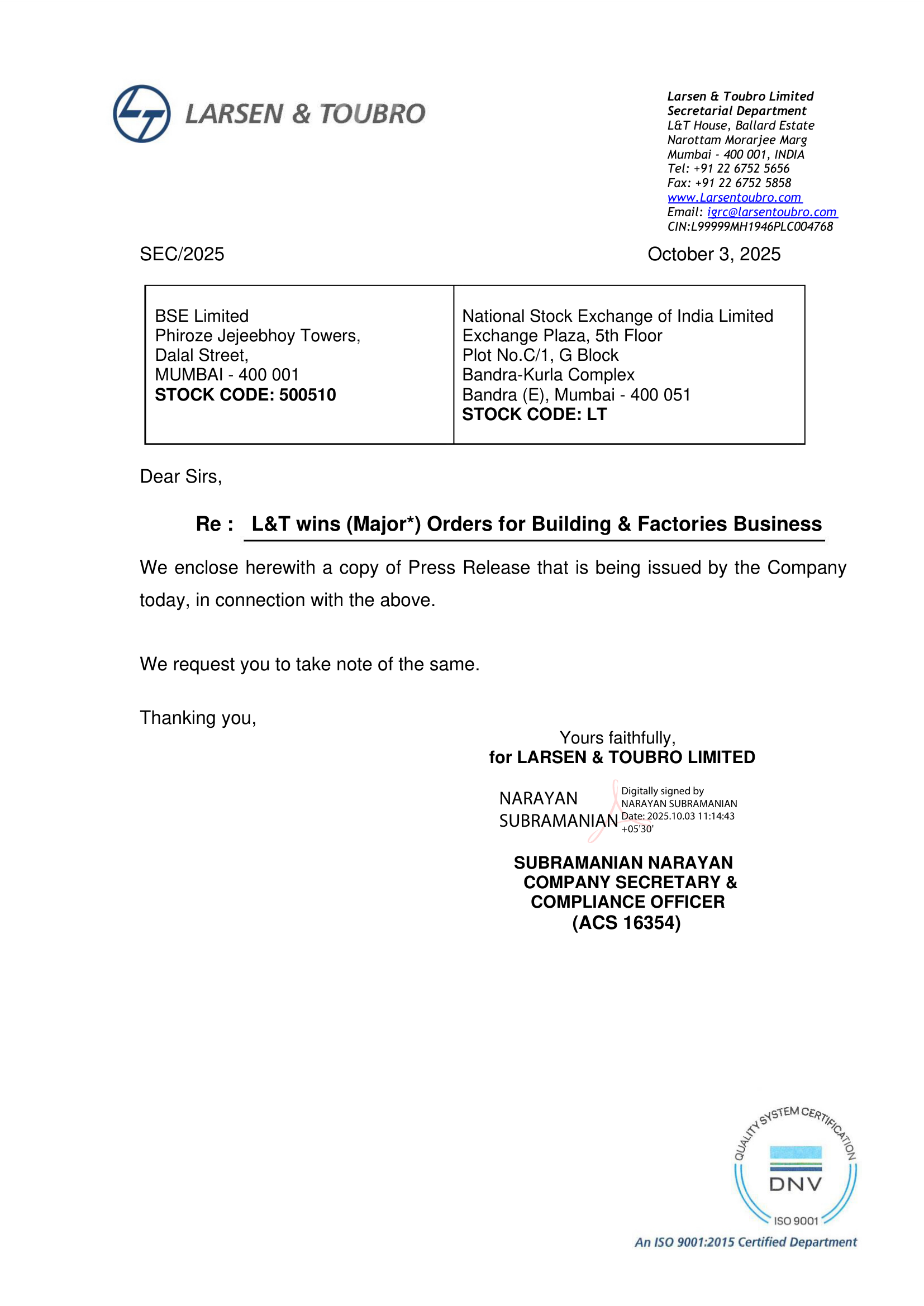 L&T Secures Major Infrastructure Orders in India Larsen & Toubro's Buildings & Factories division has secured significant projects, including a 5.9 million sq. ft. IT park in Bengaluru with LEED Platinum sustainability features and a large mixed-use development in Mumbai, demonstrating strong execution capabilities in large-scale infrastructure. Original Filing: www.bseindia.com/stock... $LT.NSE