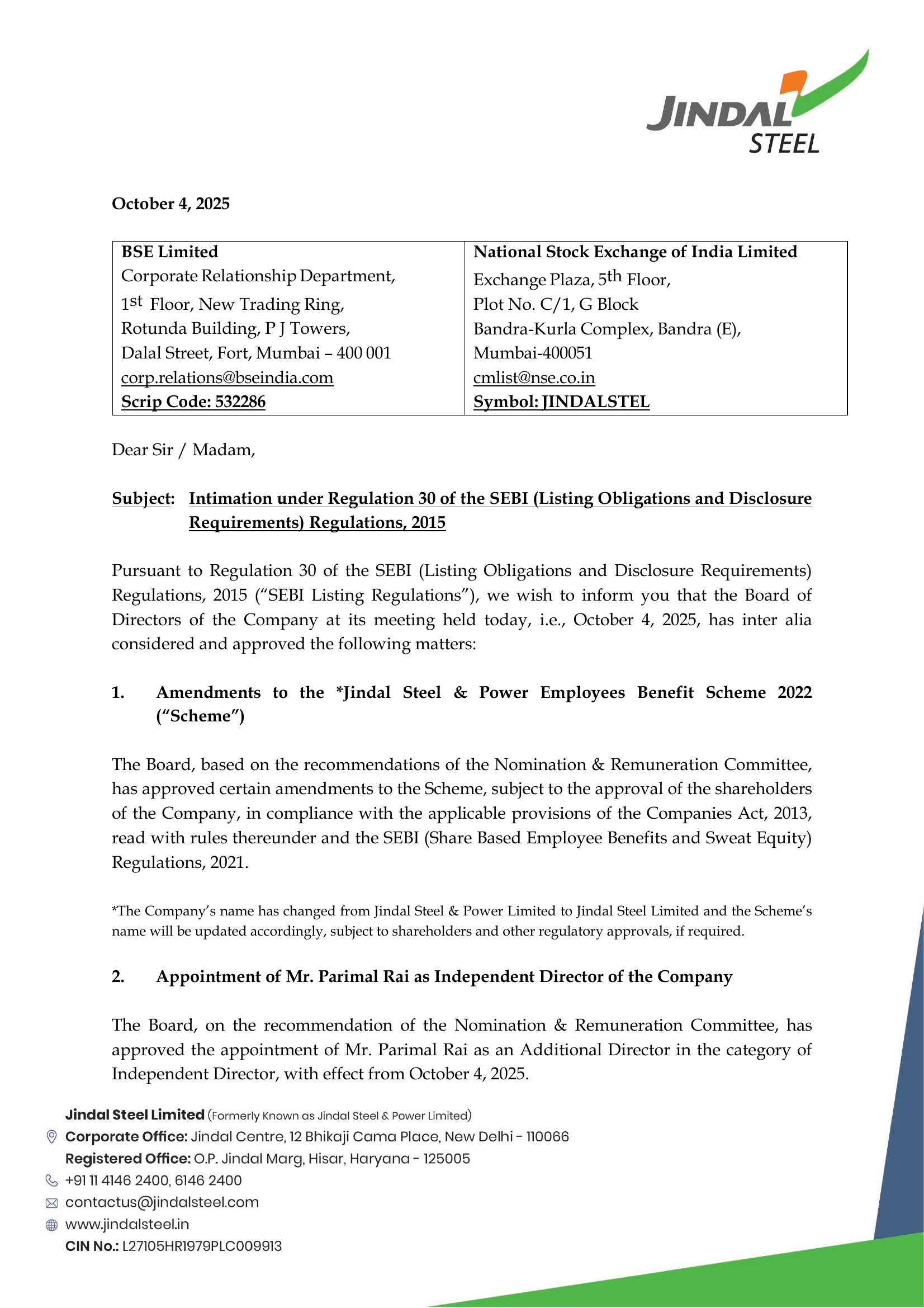 Jindal Steel Board Approves Key Appointments and Scheme Amendments Jindal Steel Limited's Board has approved amendments to its Employees Benefit Scheme 2022, pending shareholder approval. Additionally, Mr. Parimal Rai has been appointed as an Independent Director for four years, and Mr. Sunil Agrawal has been appointed as interim CFO, effective October 4, 2025. Original Filing: www.bseindia.com/stock... $JINDALSTEL.NSE #ManagementChange
