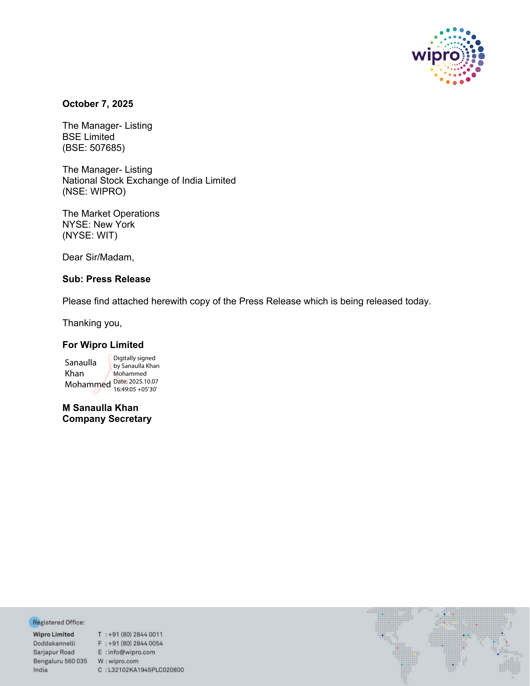 Wipro Q2 FY26 Results Announcement Wipro Limited to release Q2 FY26 results on October 16, 2025, after market hours. Conference call at 7:00 PM IST; webcast available. Monitor for performance insights. Original Filing: www.bseindia.com/stock... $WIPRO.NSE