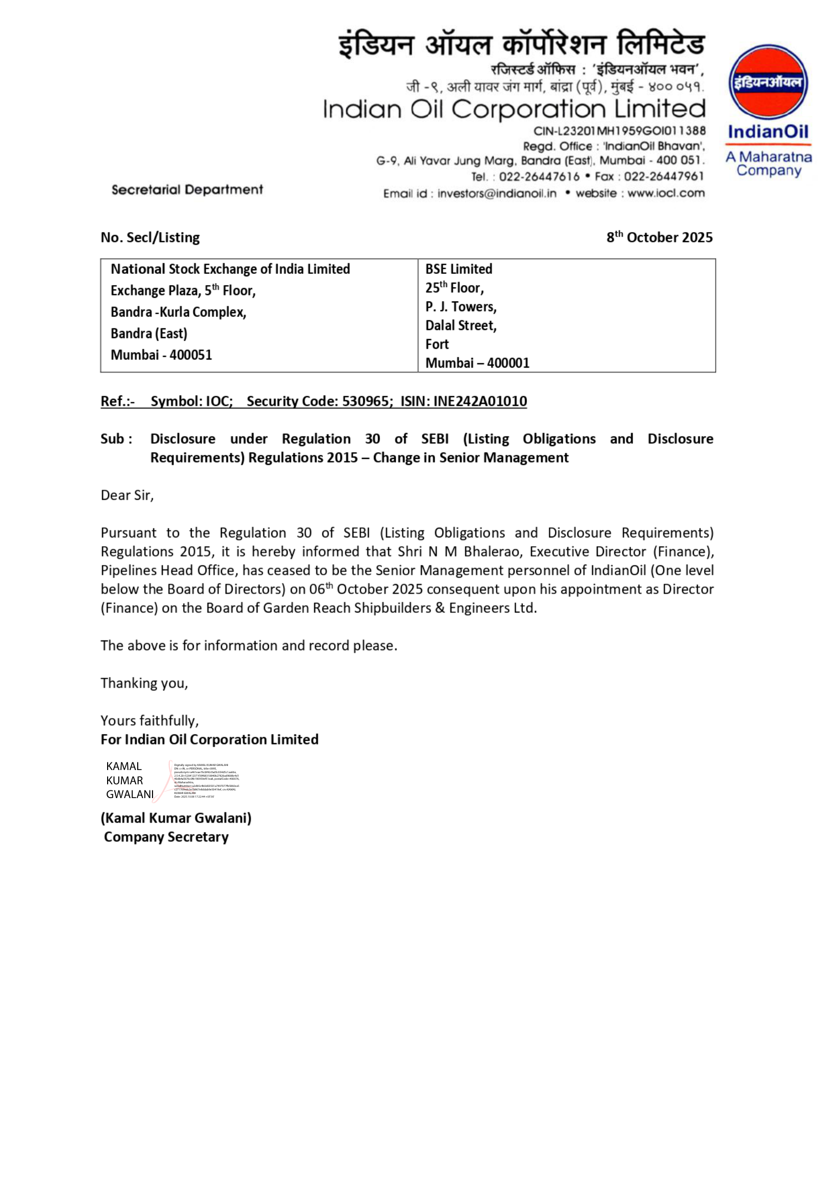 Indian Oil Executive Director Transition Indian Oil's Executive Director (Finance), Shri N M Bhalerao, has stepped down from senior management as of 6 October 2025, following his appointment at Garden Reach Shipbuilders & Engineers Ltd. Investors should note this leadership change. Original Filing: www.bseindia.com/stock... $IOC.NSE #ManagementChange