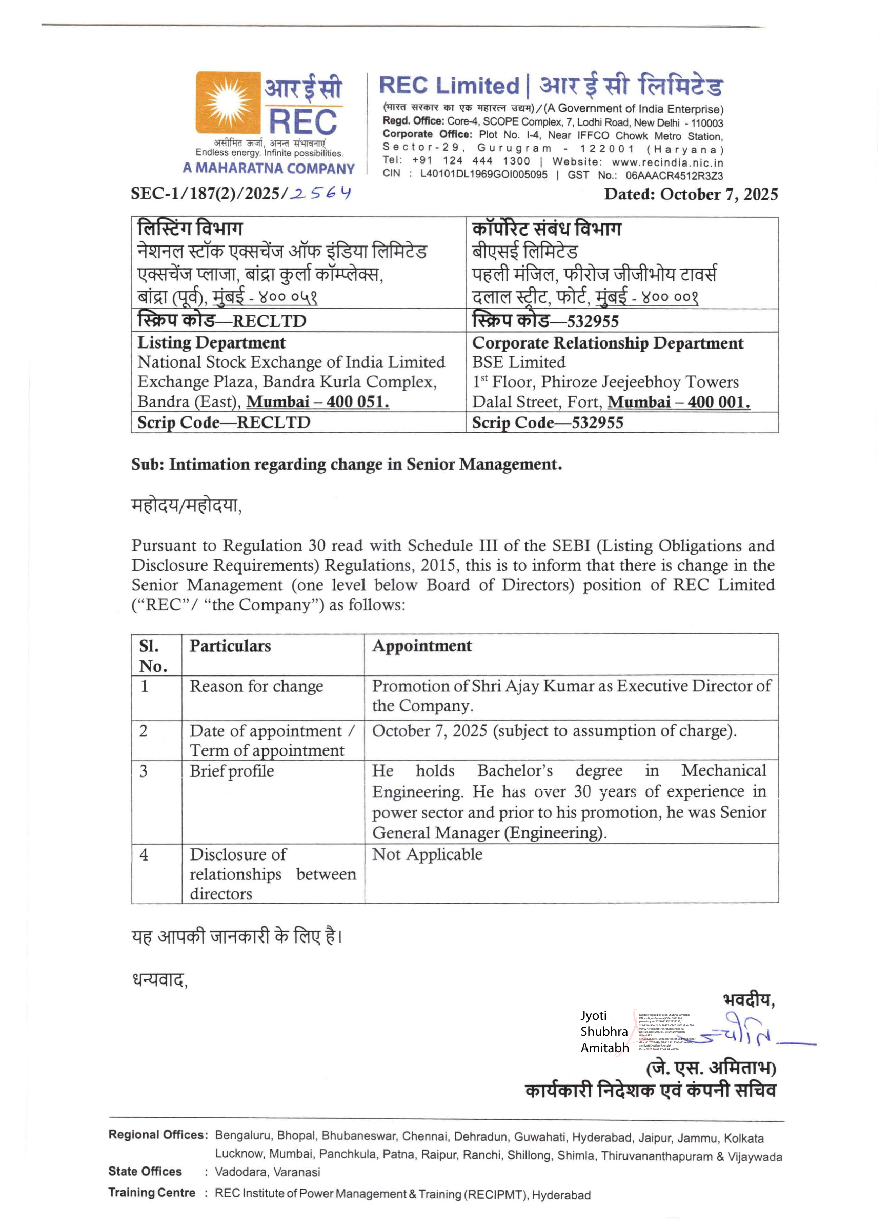REC Limited Announces Executive Director Promotion REC Limited has promoted Shri Ajay Kumar to Executive Director, effective upon assuming charge. He brings over 30 years of power sector experience. No related-party relationships disclosed. Original Filing: www.bseindia.com/stock... $RECLTD.NSE #ManagementChange