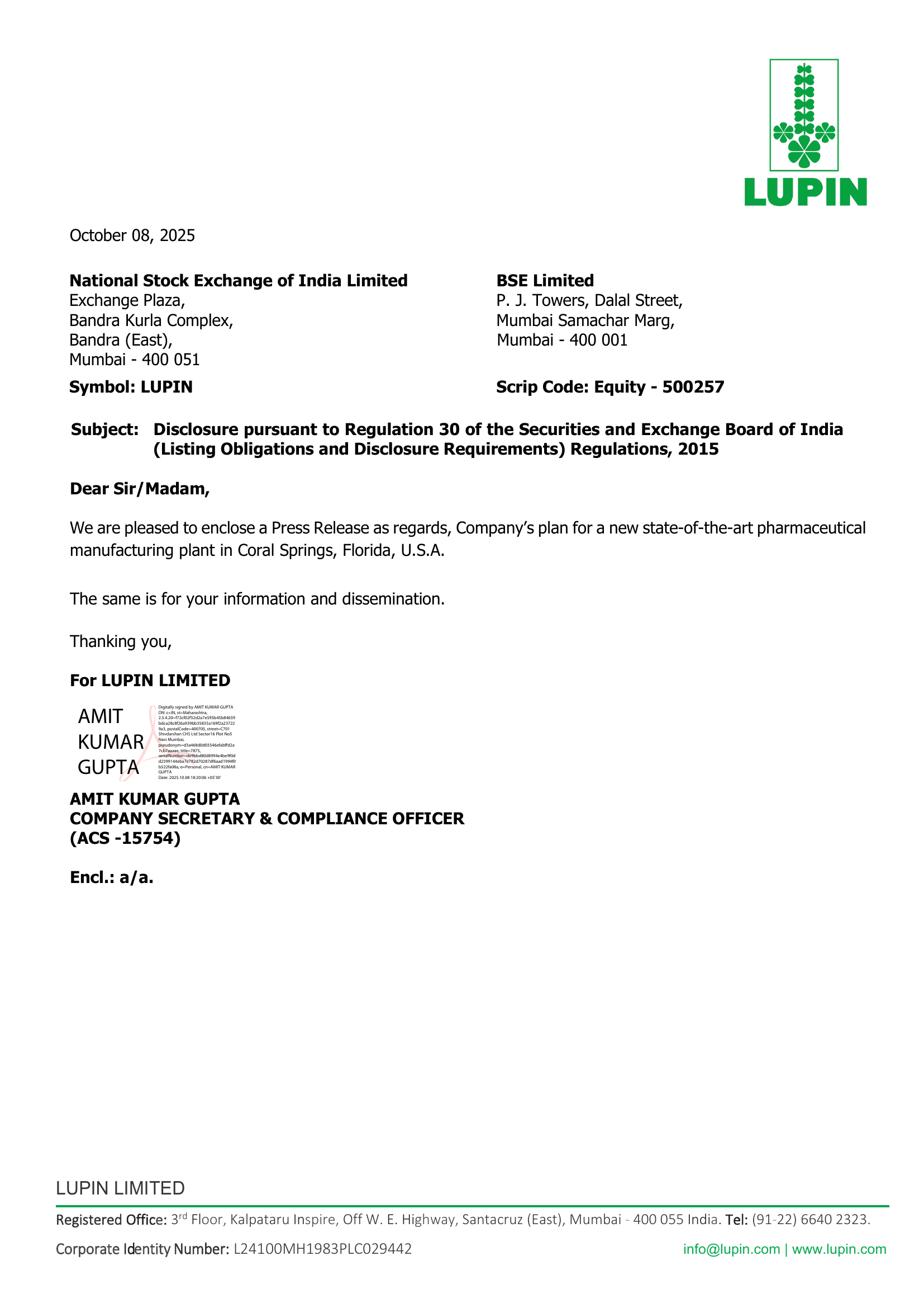 Lupin Announces New Manufacturing Facility in Florida Lupin plans to invest $250M in a new 70,000 sq ft plant in Coral Springs, FL, over five years, producing respiratory medicines and creating 200+ jobs by 2030. The project boosts domestic supply chain resilience and enhances Lupin's global respiratory leadership. Original Filing: www.bseindia.com/stock... $LUPIN.NSE