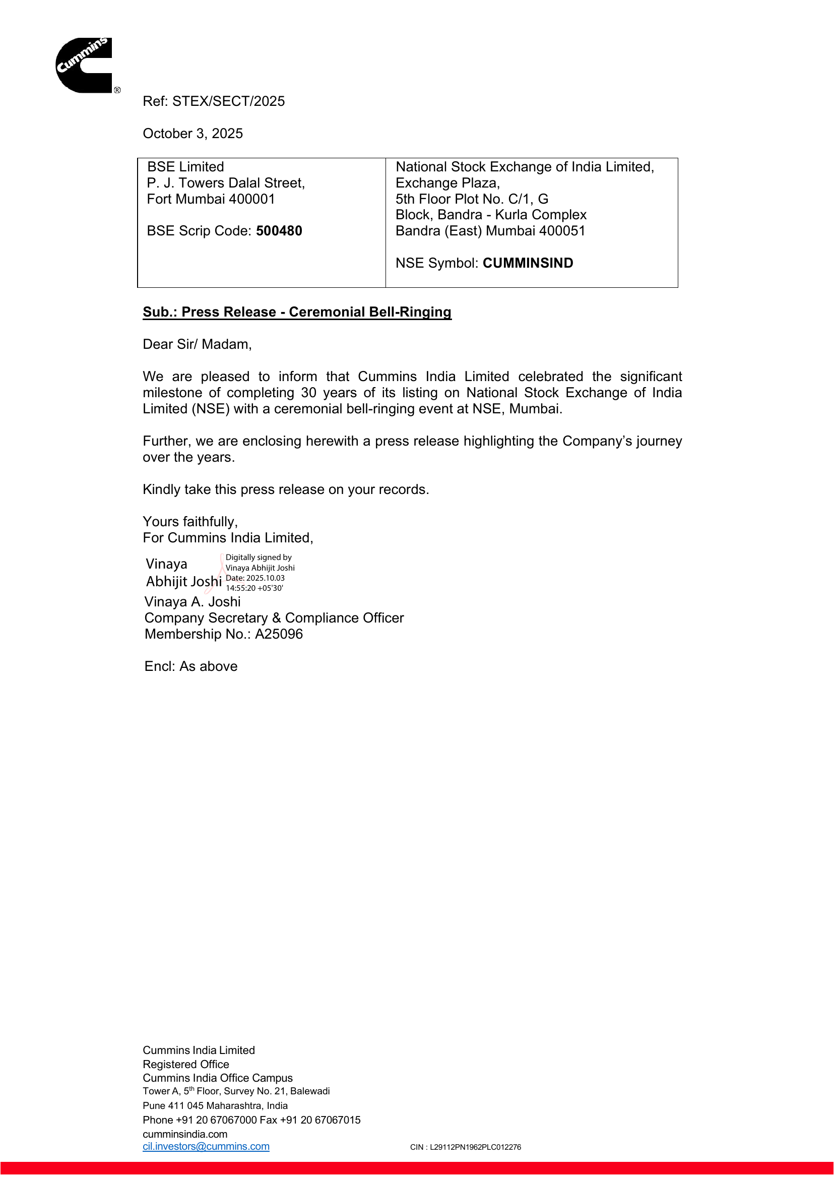 Cummins India Celebrates 30 Years of Listing and Strong Growth Cummins India marks 30 years on NSE with significant shareholder returns, revenue, and PAT growth. The company emphasizes innovation and sustainability, expanding globally across 10 segments. Investors should note its strong market cap surge and focus on energy transition initiatives. Original Filing: www.bseindia.com/stock... $CUMMINSIND.NSE