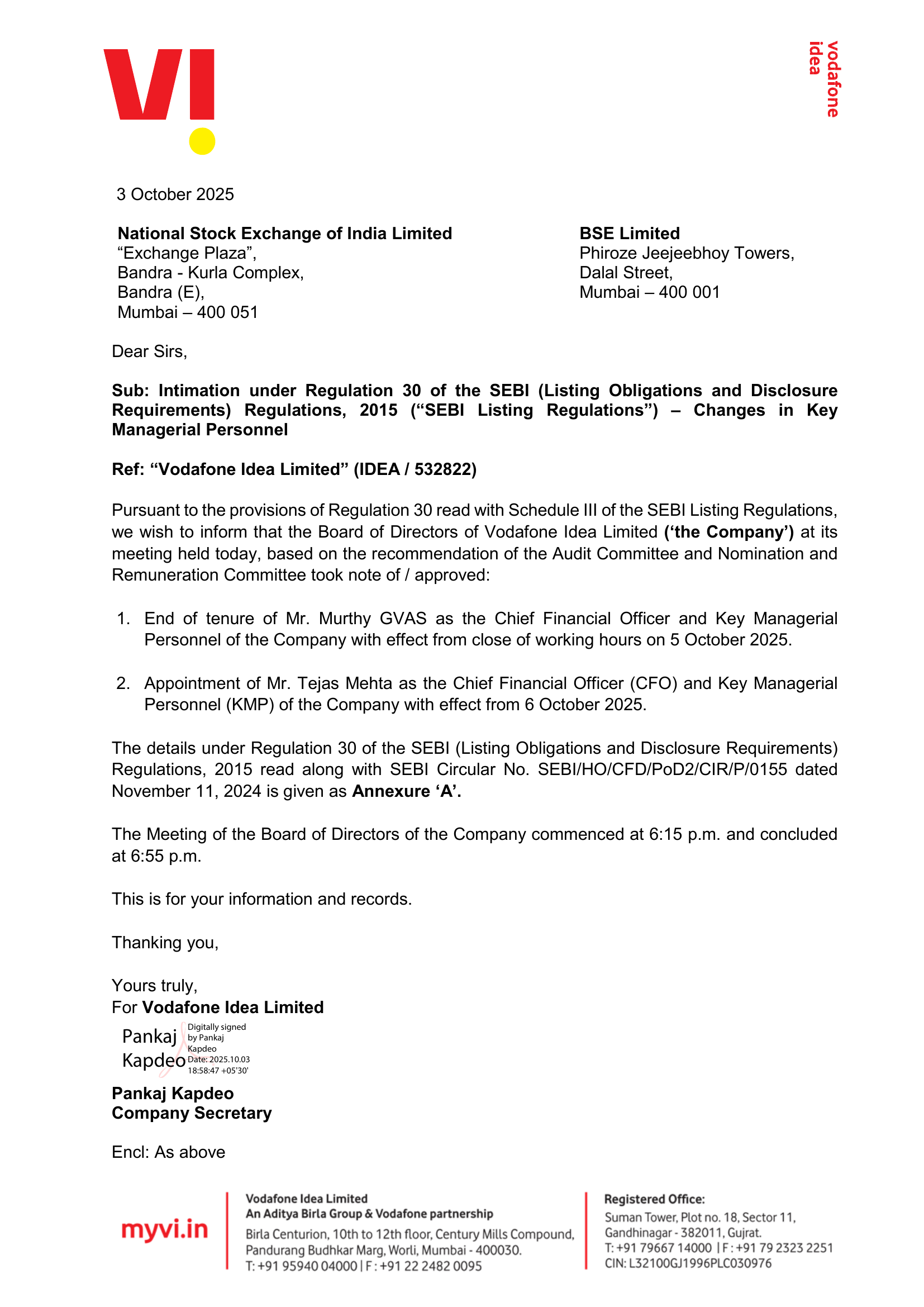 Vodafone Idea Announces CFO Transition Vodafone Idea has announced the departure of CFO Mr. Murthy GVAS, effective 5 October 2025, and the appointment of Mr. Tejas Mehta as the new CFO, effective 6 October 2025. Mr. Mehta brings over 25 years of finance leadership experience from Mondelēz India. Original Filing: www.bseindia.com/stock... $IDEA.NSE #ManagementChange